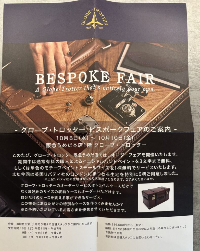 そんな折、先日阪急うめだ1階のグローブトロッターのお店で、ビスポークフェアのお知らせが!時々、日にち限定ですが梅田でもビスポークできる機会があるのです。