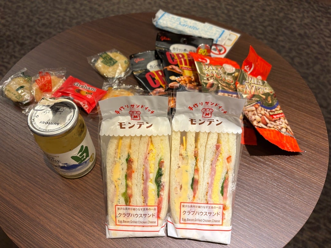 (写真は色々混ざっててすみませんあせるセットはおつまみのパック2種・サンドイッチ1個・お酒一本です)