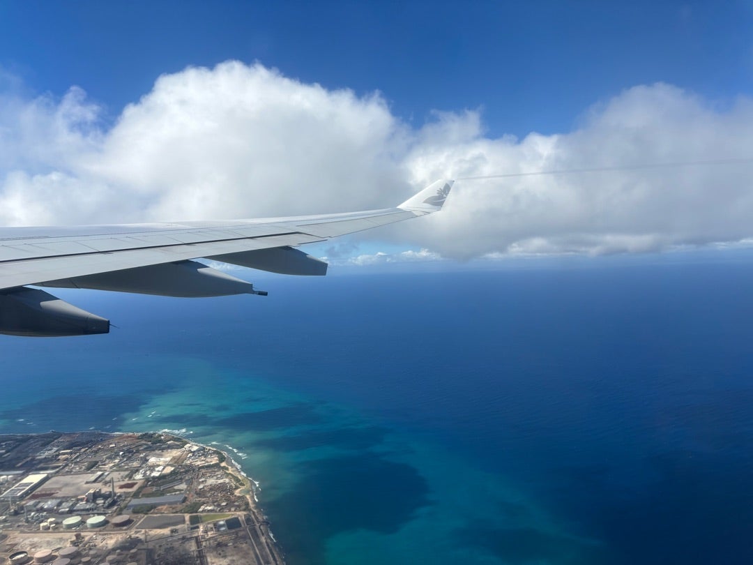 さてハワイ島に向けて離陸〜!ホノルル空港周辺のこの海の色、いつ見ても感動します。