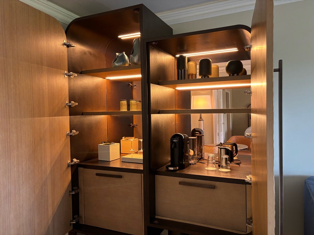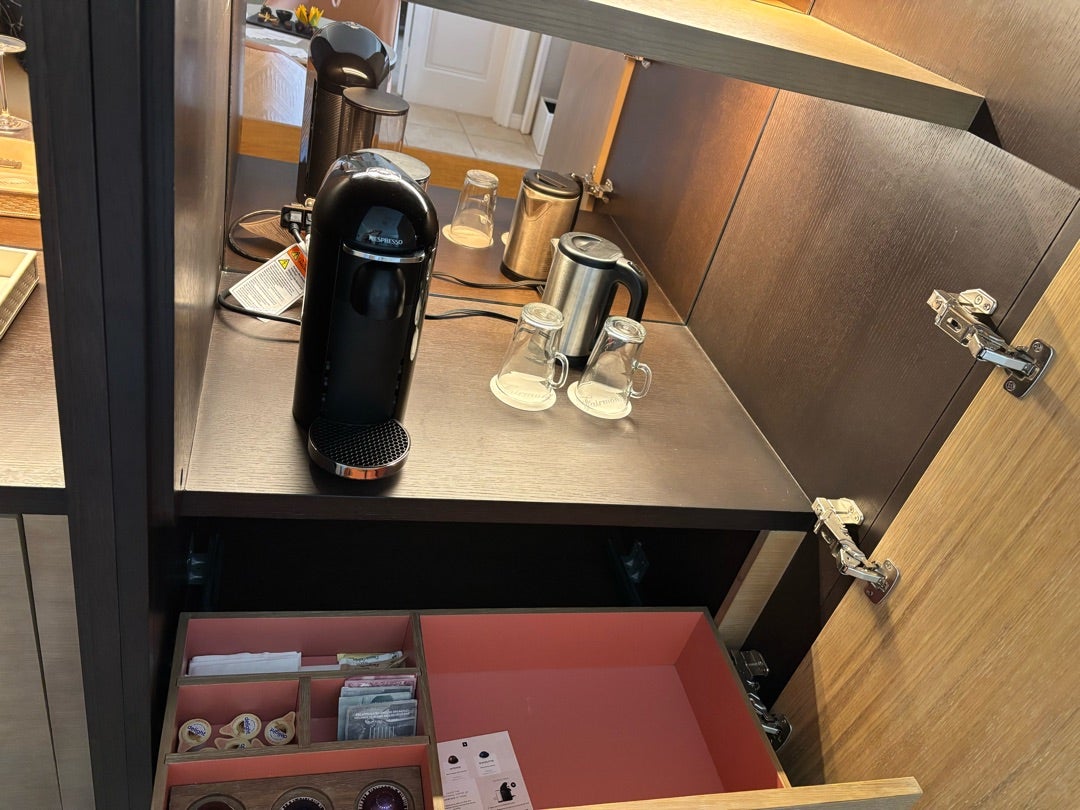 ミニバーを詳しく。湯沸かし、コーヒーメーカーとコーヒーのカプセル、ティーバッグ4種類など。