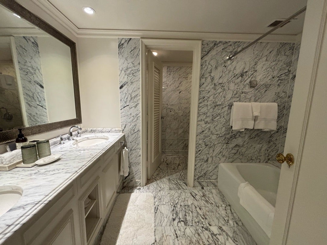 ドレッサーの奥にバスルームがあります。ダブルシンクの洗面所とバスタブ。