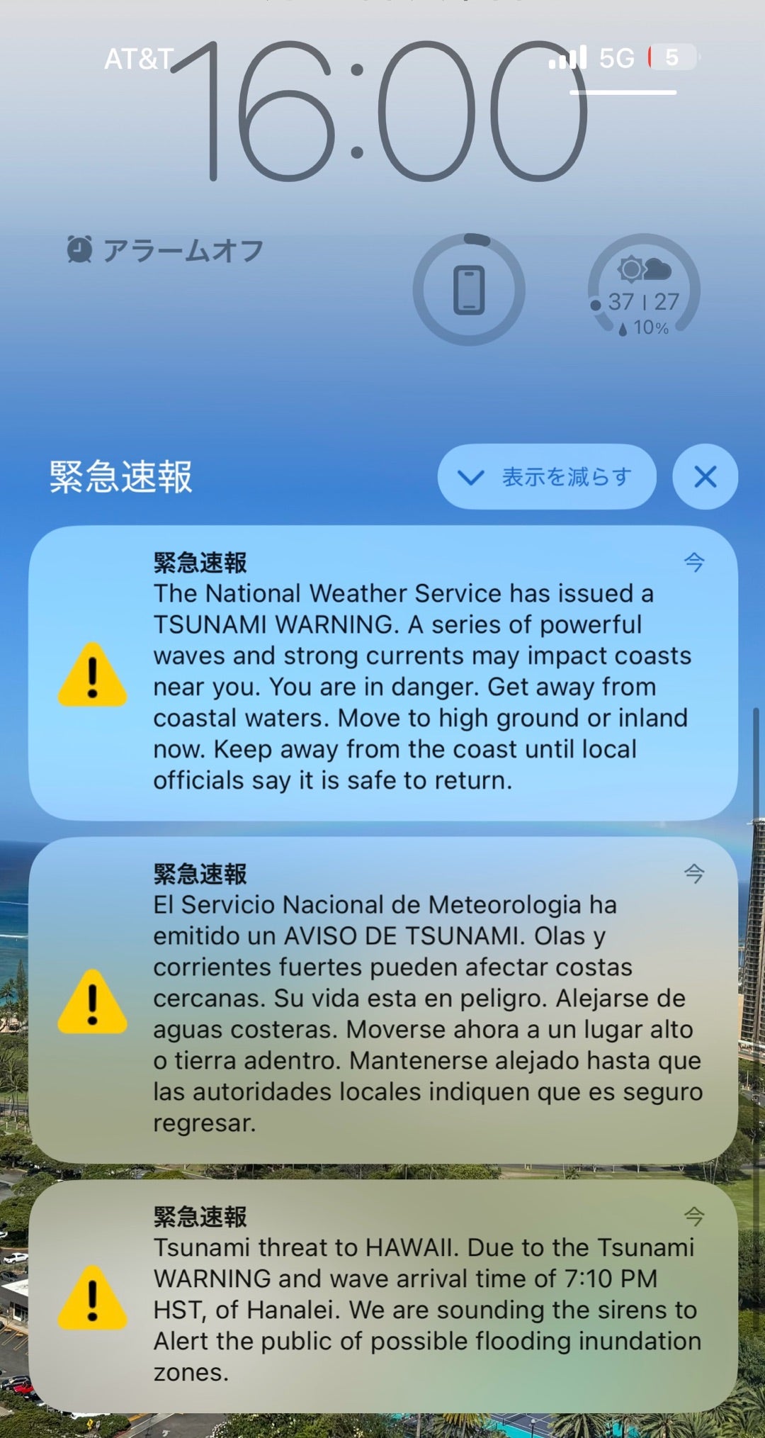 その後も何度もTsunami Alertが。こんな感じです↓(電池残量がすごい笑)