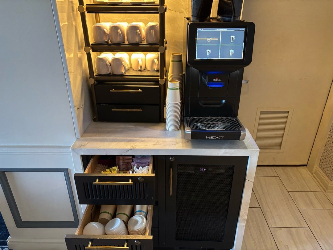 このエスプレッソメーカーは日中ずっと使えるものです。テイクアウト用の紙コップや蓋もあります。