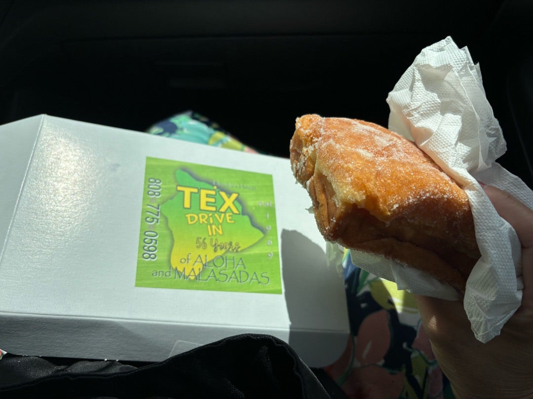 マラサダはこんな感じで四角くて大きめでした。←ホノルルのマラサダ(レナーズやぺニーズ)と比べて良心的な大きさと味で、いい意味で田舎らしいマラサダでした![]()