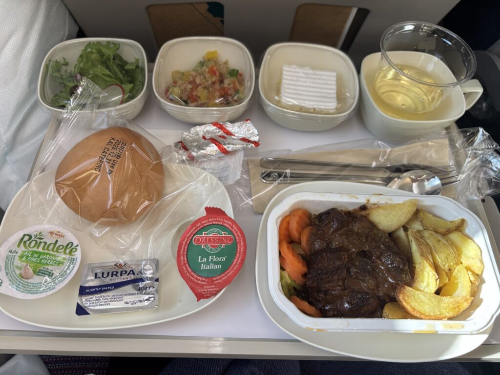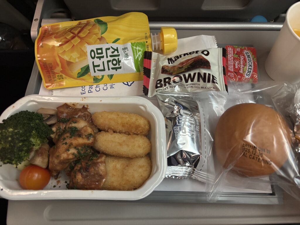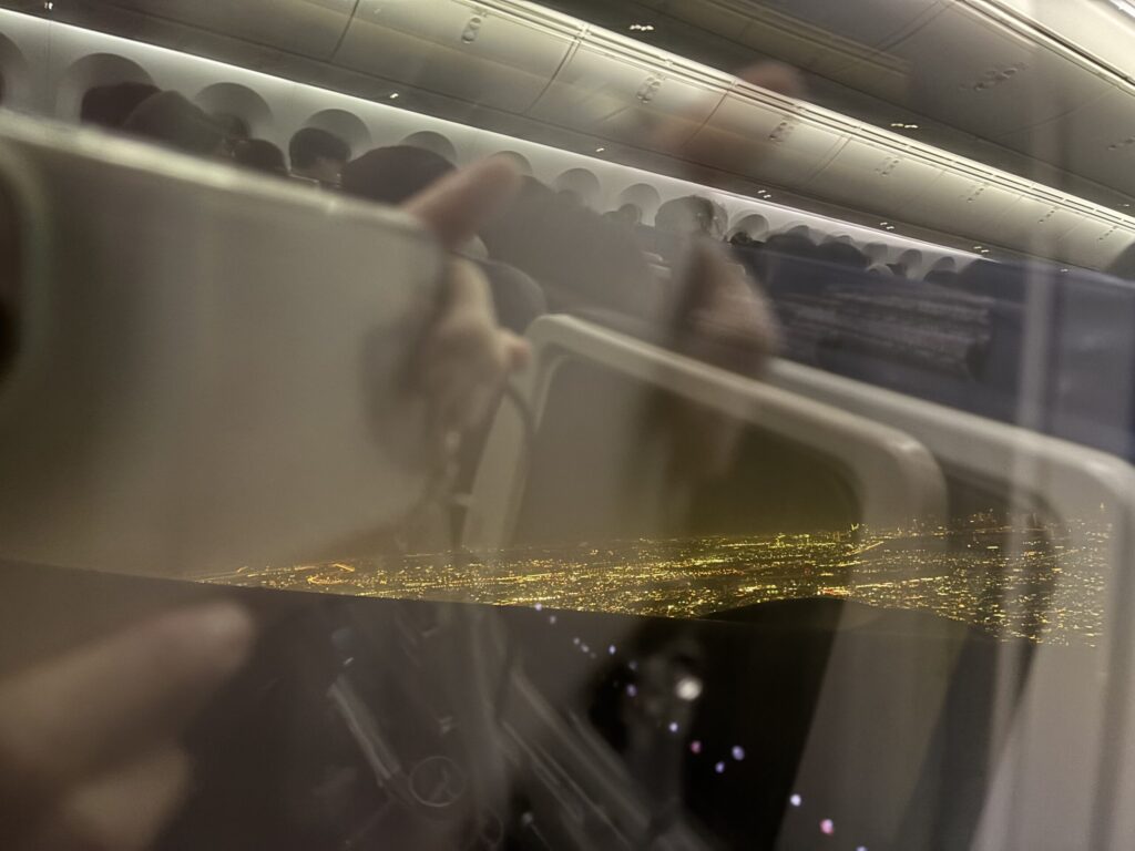 数時間おきに機内食がきて、それ以外の時間は消灯して就寝しなさいモード。全く動いてないのに食事ばかり来て、搭乗前にラウンジでも食べていたこともありちょっと多すぎましたー💦