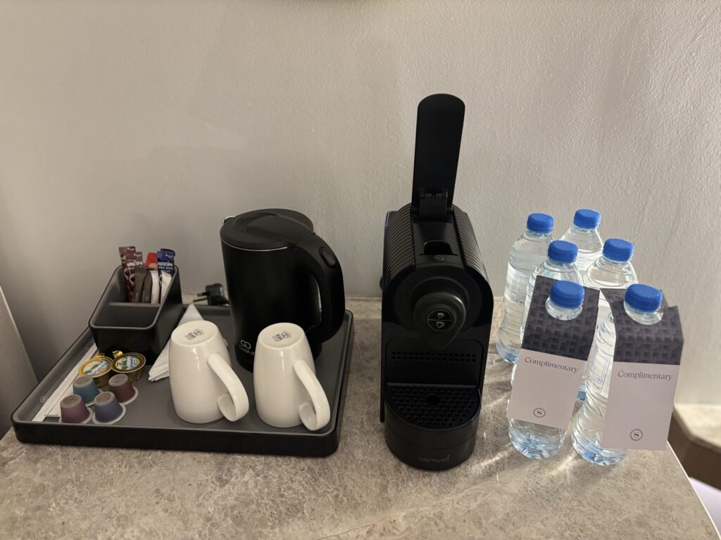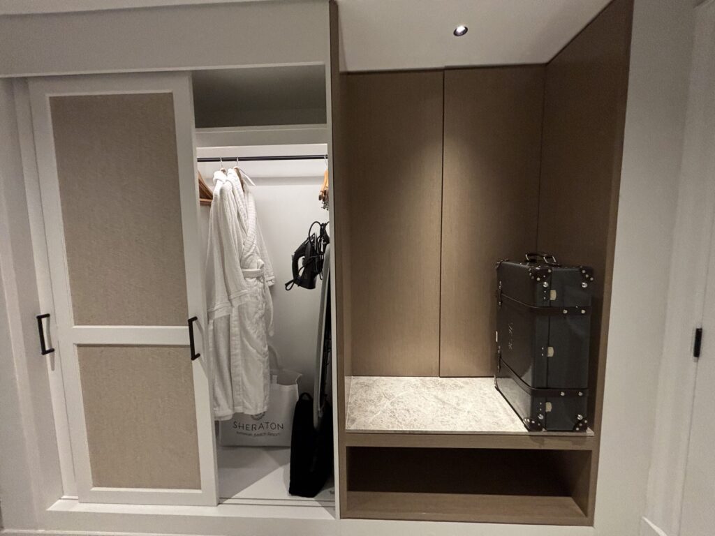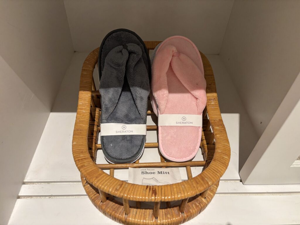 ツインのお部屋で、5人で泊まるにはちょっと手狭でした💦クローゼットは妥当なサイズでした。クローゼットにスリッパの用意が。海外でアメニティに期待していなかったのでこれは意外✨トングでパイル時のサンダルなの珍しい🩴ビーチ用おでかけセット(バスタオルが入ったバッグ)も。