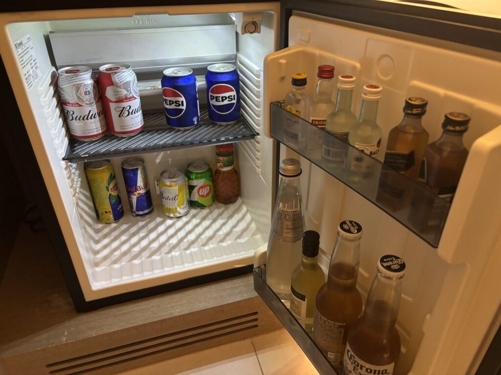 お茶コーナーにはペットボトルの水が豊富にありました。冷蔵庫内は空ではなく小さめです。