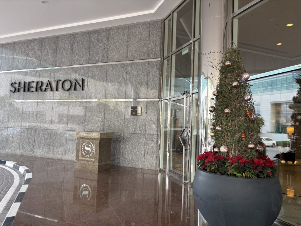 ホテルまであと数百メートルというところから全然進まず、降りて歩こうかとも思ったぐらい。30分近くかかりました。。空港を出て1時間、21時過ぎようやくシェラトンに到着!