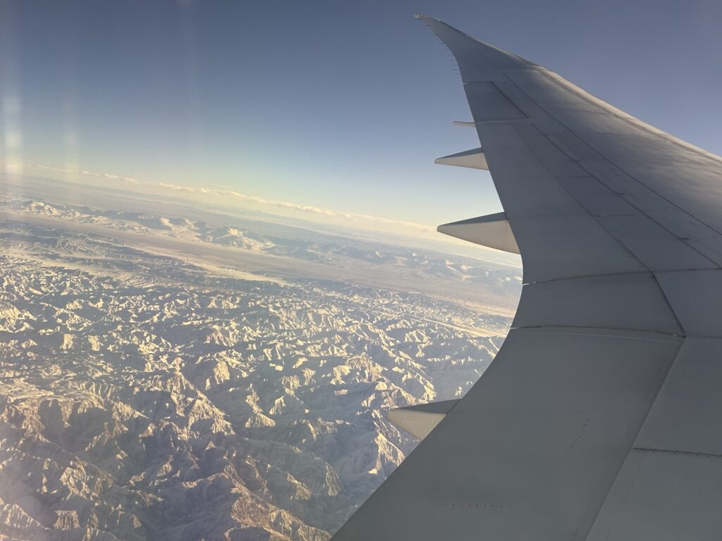 そのとき少し窓を明るくして外を見ると、こんな絶景が広がっていました!場所的にチベット高原かな?