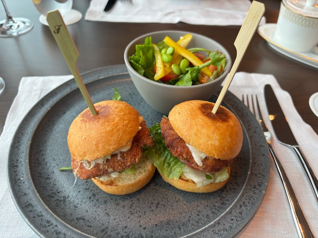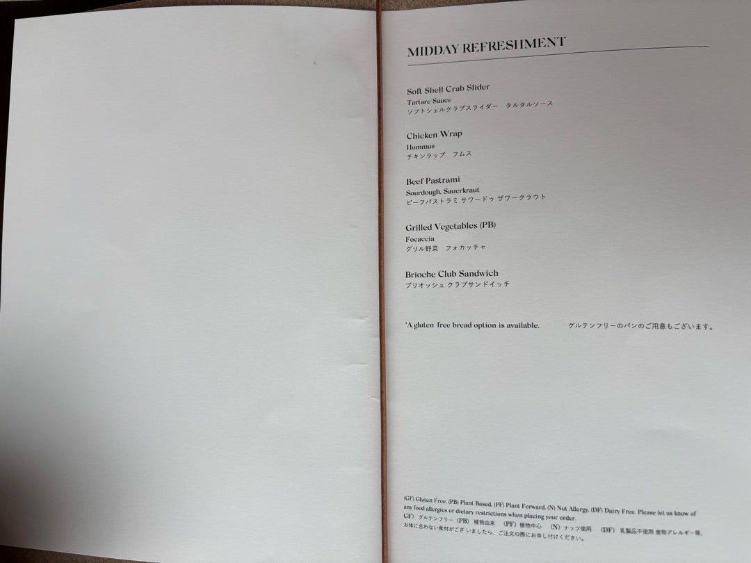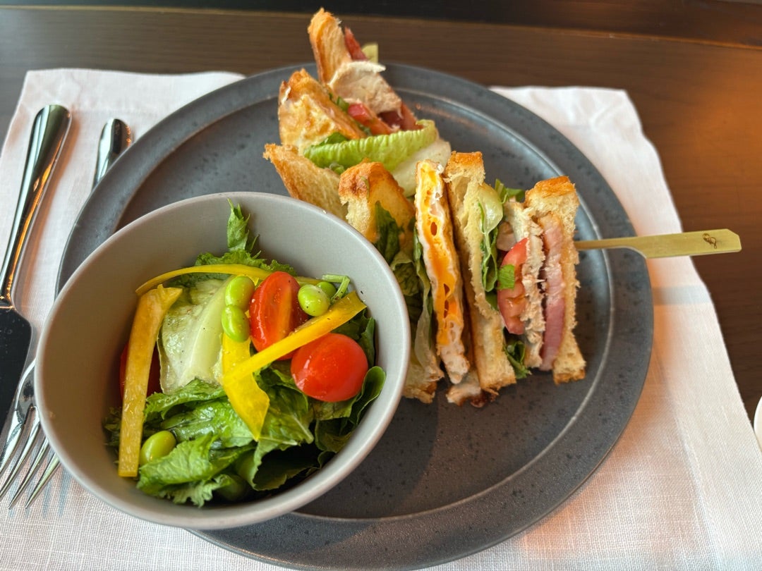 13時前にラウンジへ。11時〜13時のリフレッシュメントの時間は軽食が出ます。メニューは5種類。