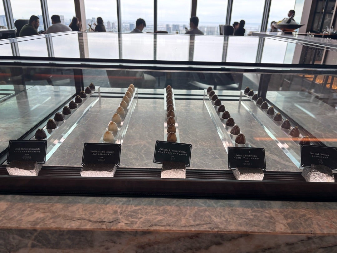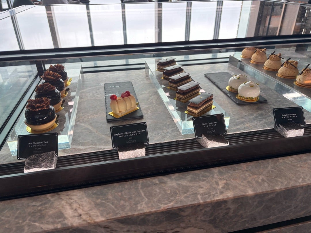 このレストランの一角にガラスケースがあり、スイーツが売られておりテイクアウトできるようです。ラウンジのアフタヌーンティーで出てきたようなチョコやケーキがありました。チョコ一粒600円、ケーキ一個1200円ぐらいでしたので、ラウンジのありがたみを痛感しましたアセアセ