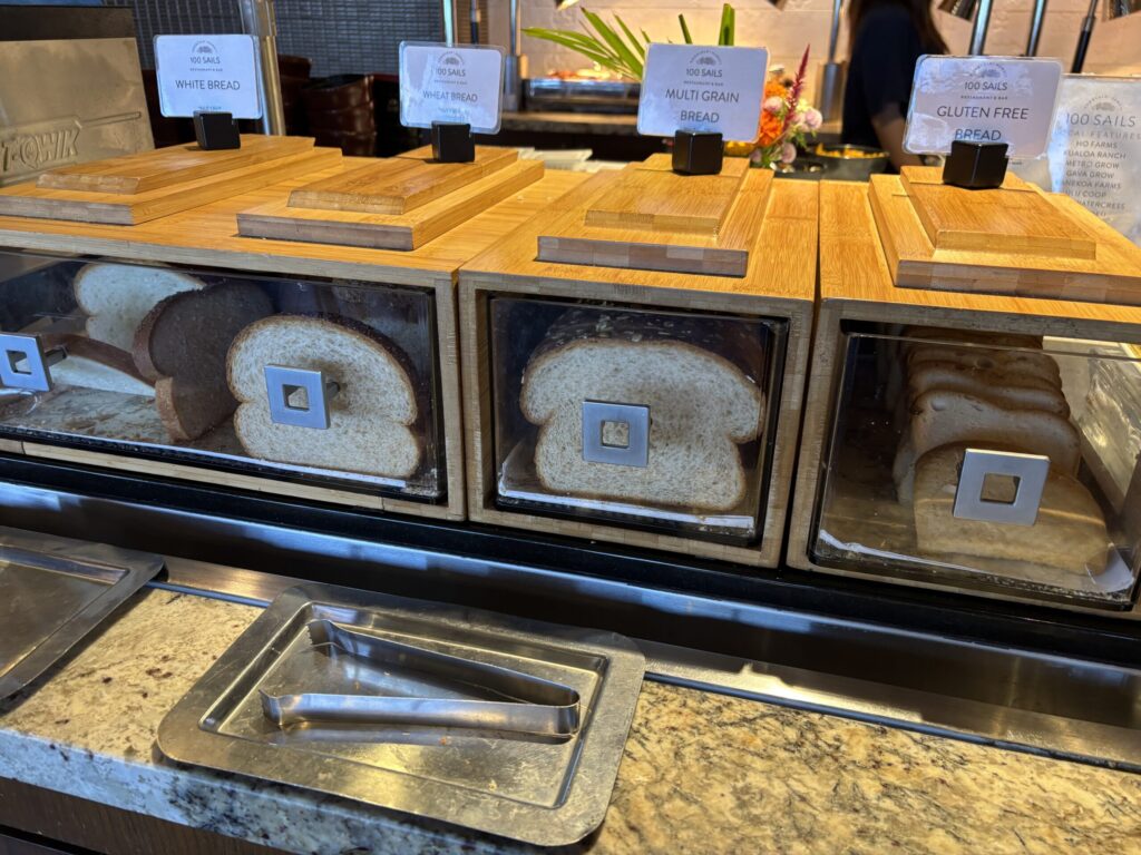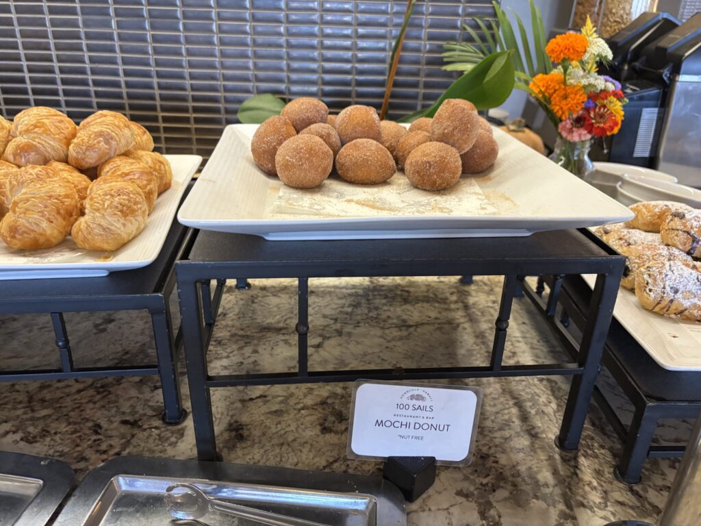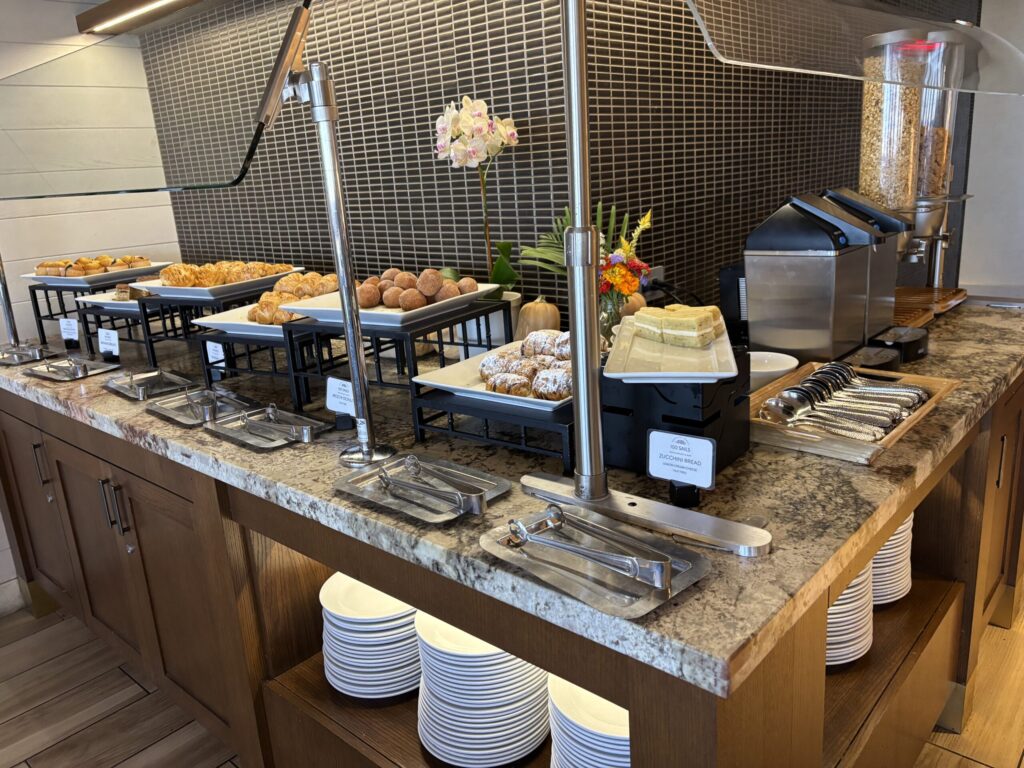 ブッフェはこんな感じ。サラダ、パン、ホットミールのほかに、納豆や白ごはん、味噌汁、温泉卵などの日本食メニューが充実してます!