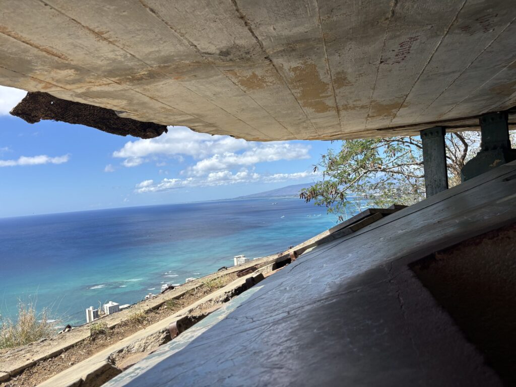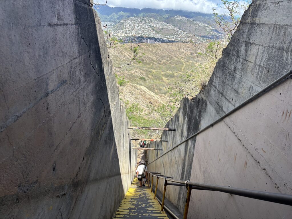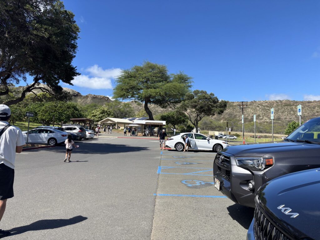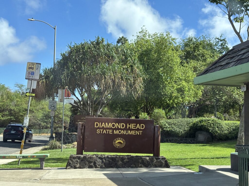 ワイキキから10分足らずでこのダイヤモンドヘッド入り口に到着。ここを右折するとトンネルがあり、それを抜けると駐車場です。駐車場入り口に受付があり、そこでQRコードを見せます。