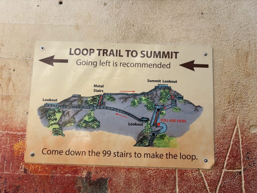 最初は舗装された平坦な道→途中から舗装がなくなって細い道→階段→洞窟を抜けると、こんな看板が。山頂まで後少しです!
