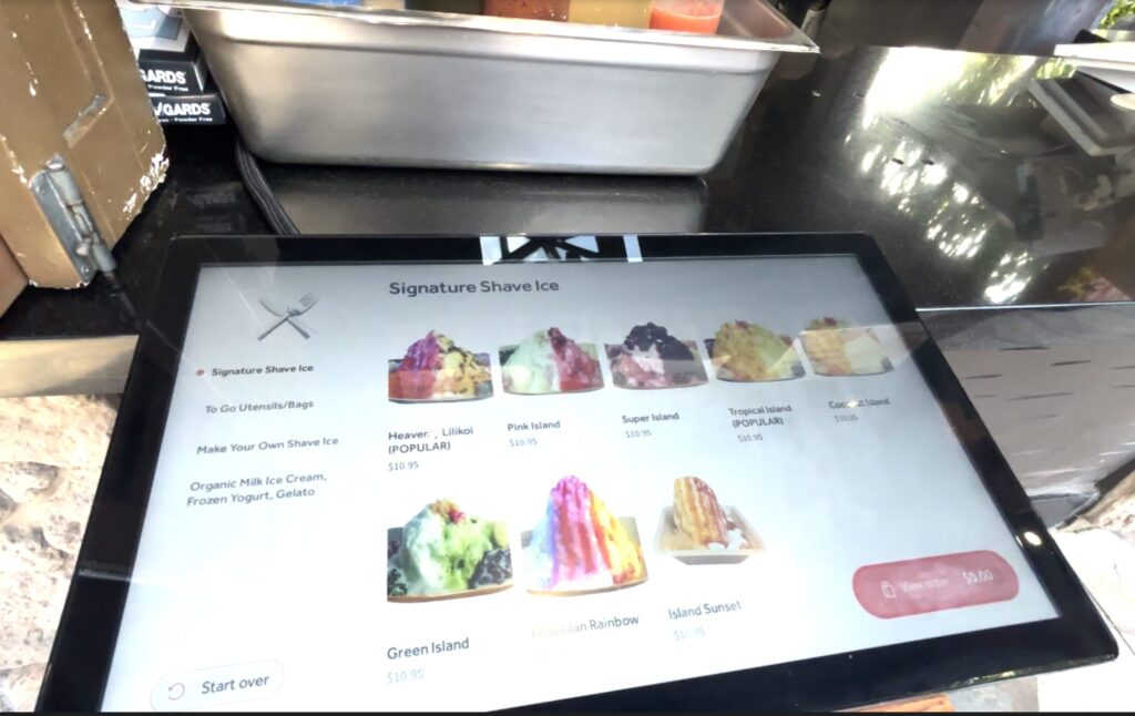 ここのシェイブアイスは、タッチパネルでフレーバーやトッピングを自分でカスタマイズできるようになってます。レインボーシェイブアイスにしたのですが、デフォルトのココナッツフレーバーは子供が好きでないと思いアサイー味に変えたところ色もアサイー色に変わってしまい、レインボーじゃなくなってしまいました爆😱