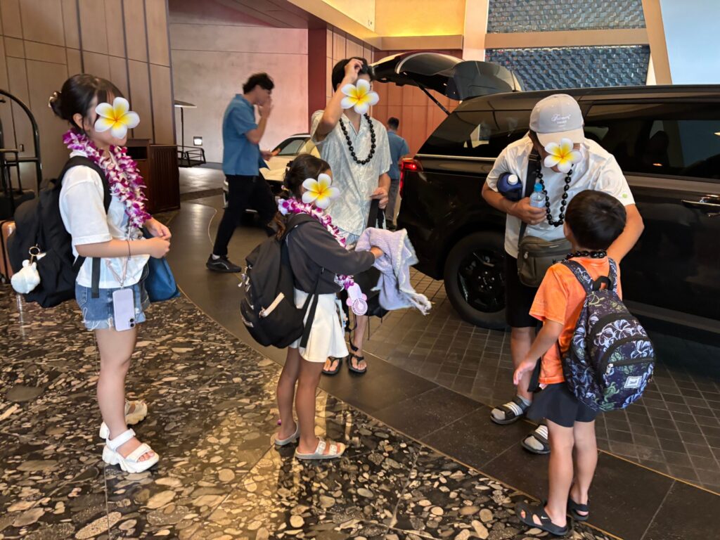 みんなレイをかけている最初のうちにここで集合写真を取るのも恒例です。