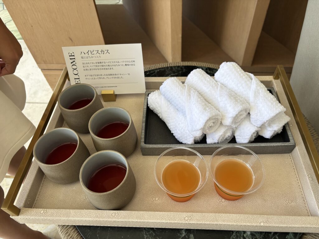 今回のウェルカムドリンクはハイビスカスティー。子供にはグァバジュース。