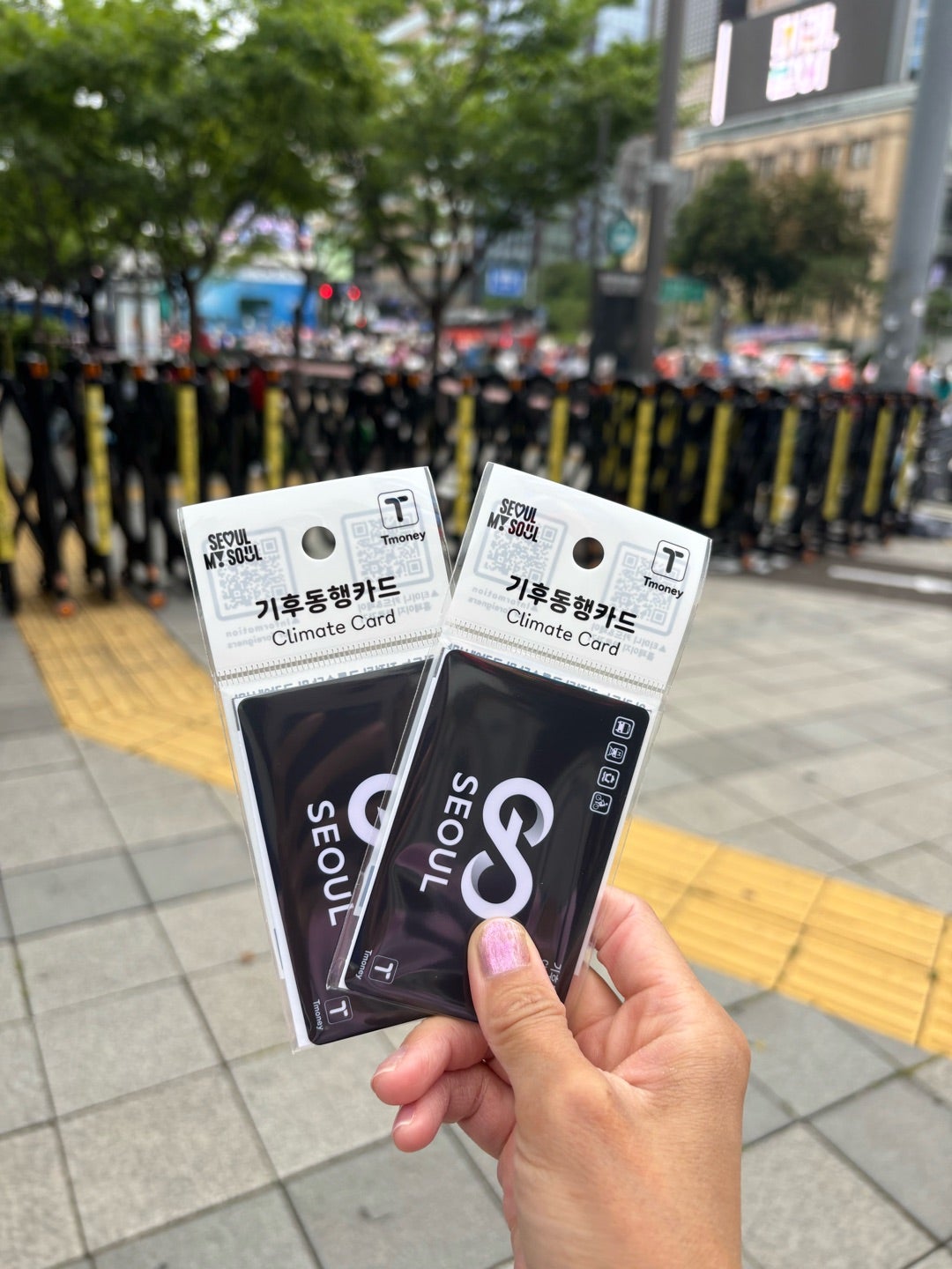光化門にまっすぐ向かう大通りを歩き、CU(コンビニ)で気候同行カードを購入。店頭に出てないのでレジで聞いたら出してきてくれました。(英語でも韓国語でも何ていうか名称分からず、ガイドブックの写真を指差して伝えました。ガイドブック持っててよかったグッ)