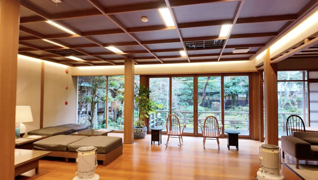 早速チェックインします。入ると正面のロビー越しに日本庭園が広がります。