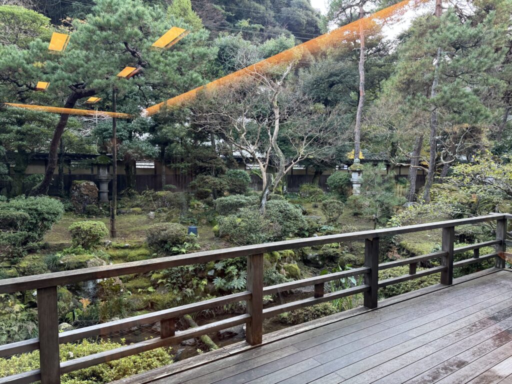 窓の外に広がる日本庭園。