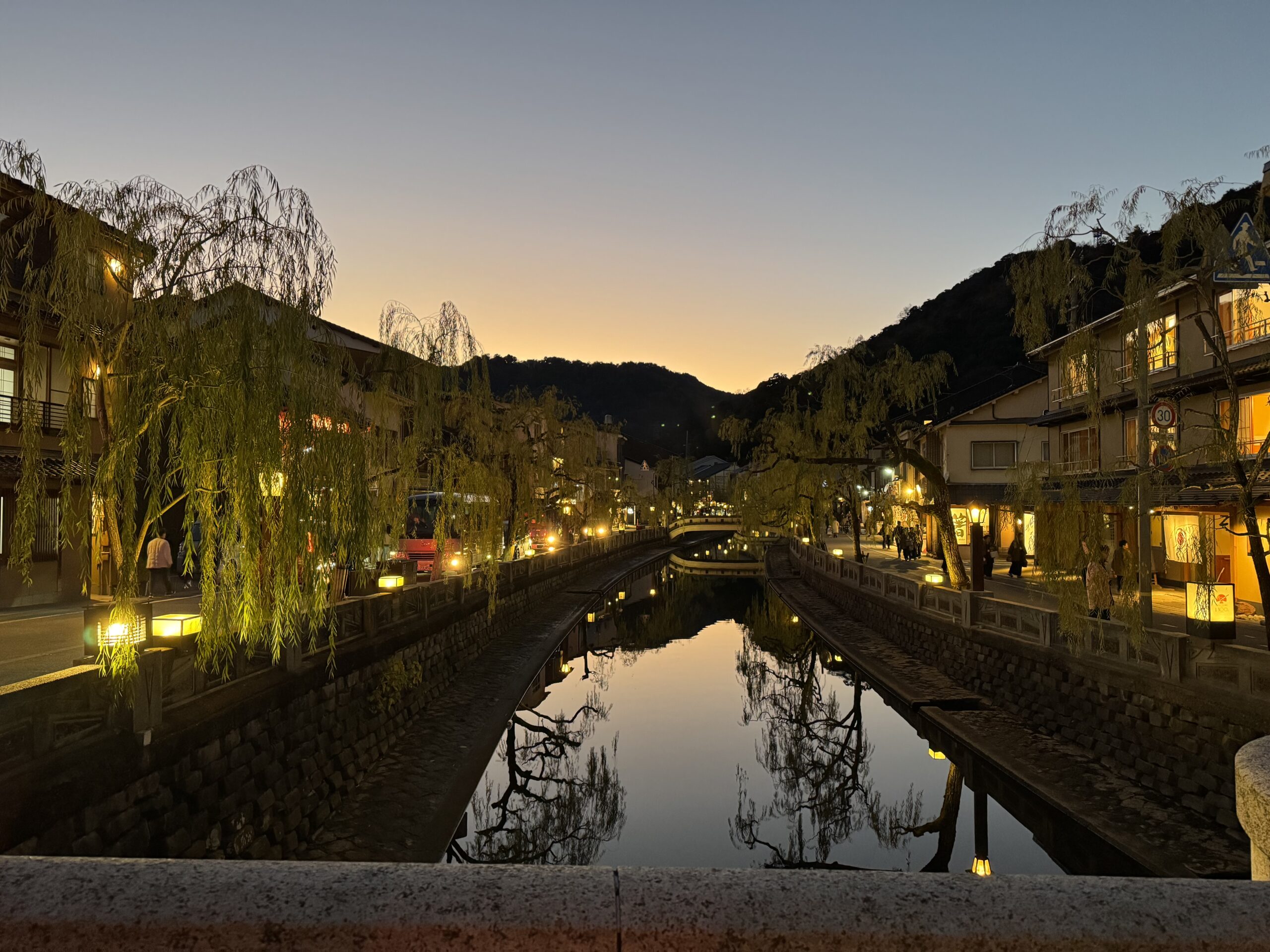 さらに川沿いを歩きます。日が暮れてきて灯りがともり始めました💡
