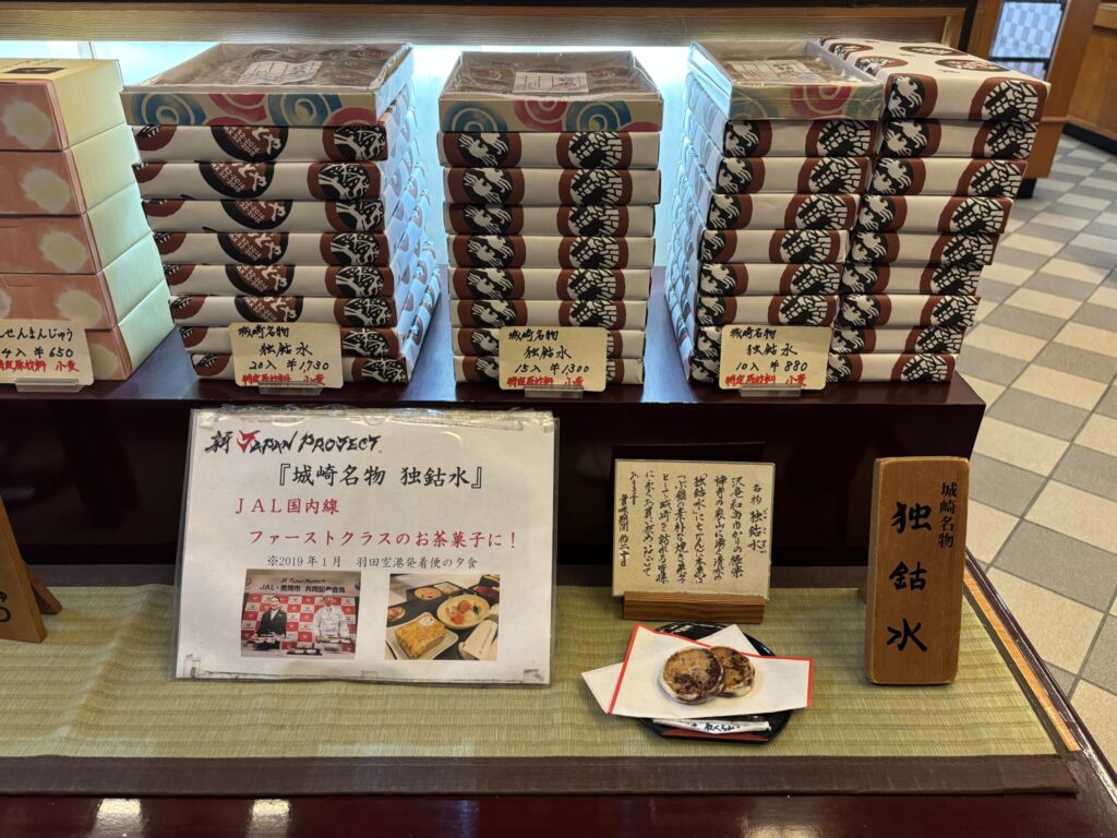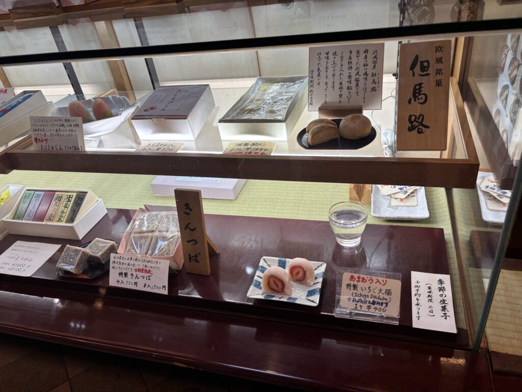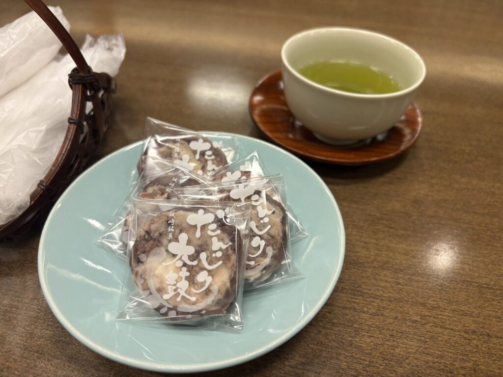 お菓子「だんじり太鼓」はここのショップでも売られてました。あんこと饅頭の皮みたいな生地が練り合わせったような和菓子です。城崎温泉の有名な和菓子のようです。