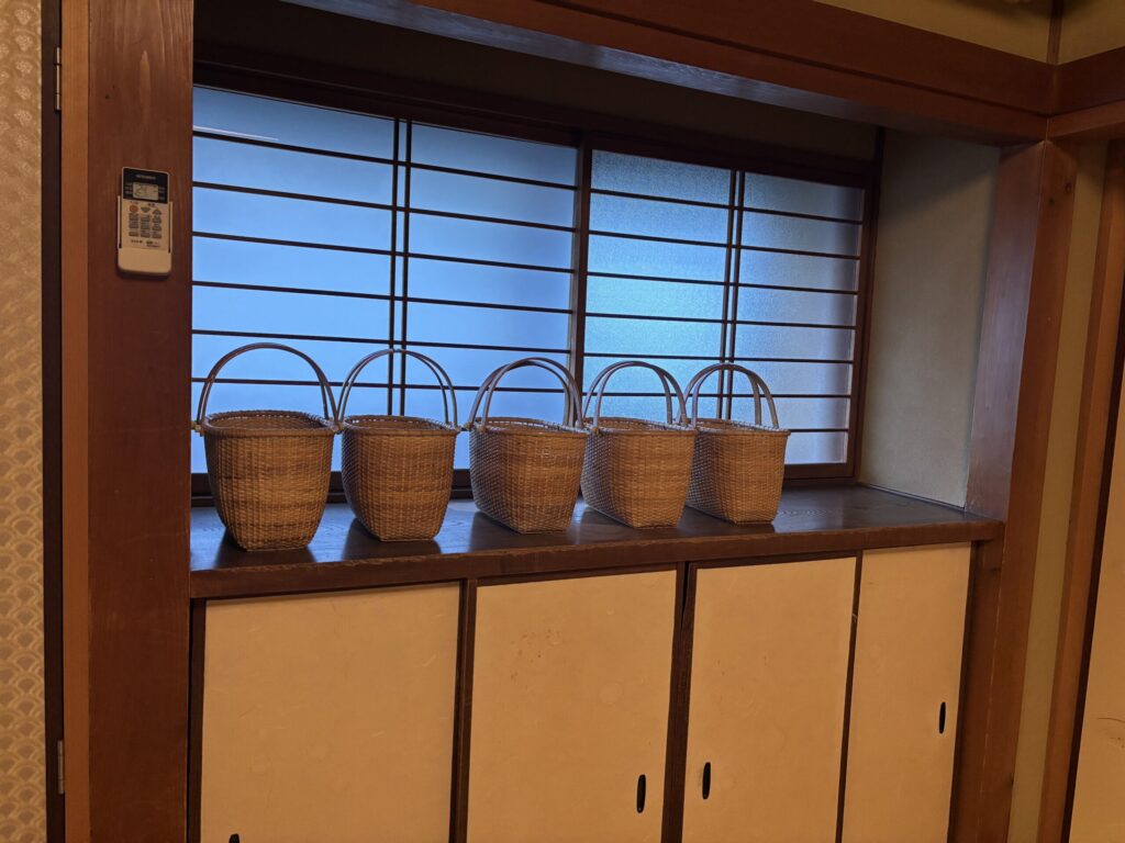 足袋は、丁子足袋。裏の滑り止めがしっかりグリップが効いてました。外湯へのお出かけ用に、カゴが用意されています✨