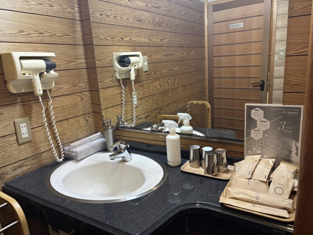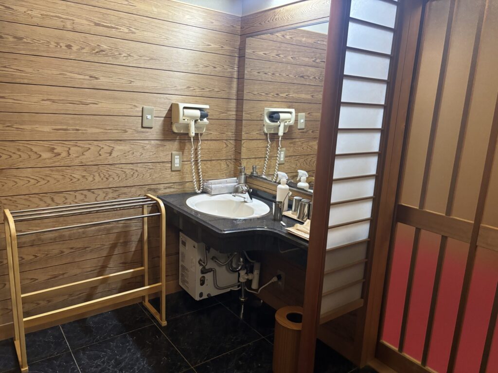 入り口すぐのところにあるお手洗いと洗面所。歴史ある旅館でなのでお部屋などは古さがありますが、水回りは新しめでした✨