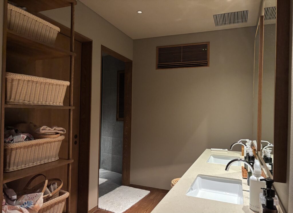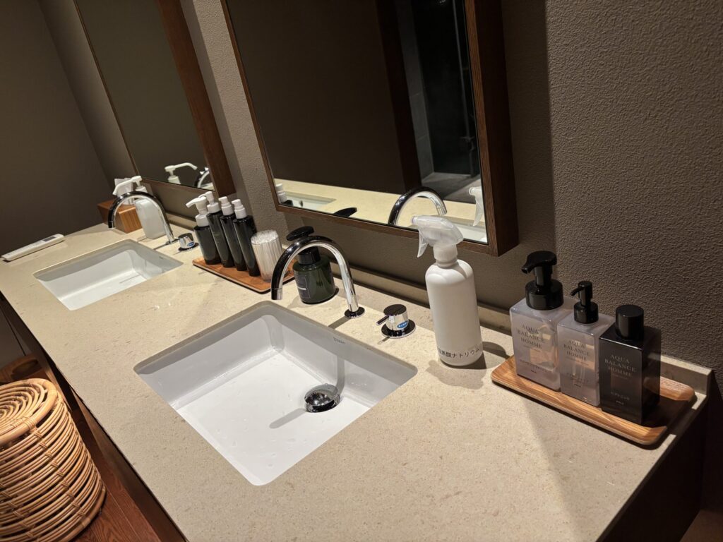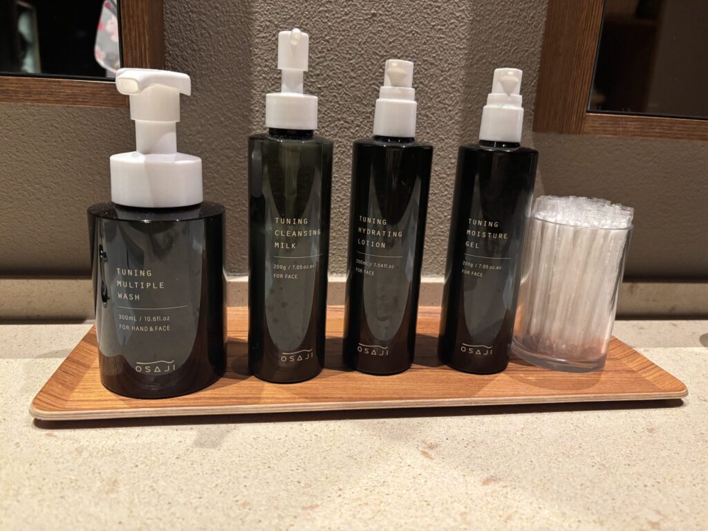 すっきりと綺麗な脱衣所。スキンケア用品はOSAJIのもので、クレンジングミルク、洗顔料、ローション、ジェルがありました。