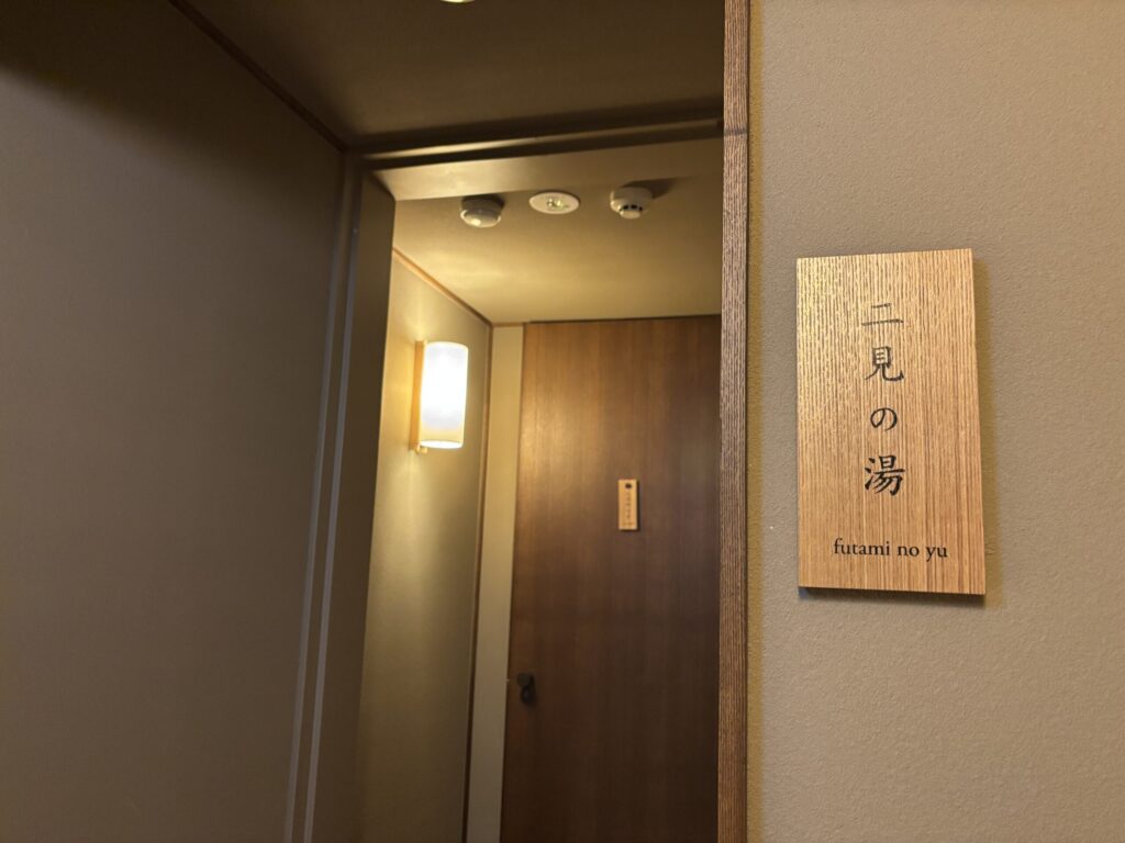 すると、貸切風呂がたまたま空いてたのでみんなで入ることに。この旅館は貸切風呂が2つあり、予約不要で空いていれば自由に使えます。「使用中」の札をかけて中から鍵を閉めればOK。