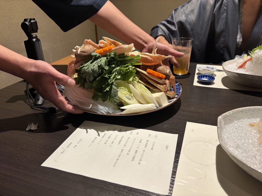 次にかにすきの用意が来ました、生の食材を見せれくれた後一旦引き上げて、鍋ができてから持ってきてくれるスタイル。なので鍋の世話をする必要はありません。