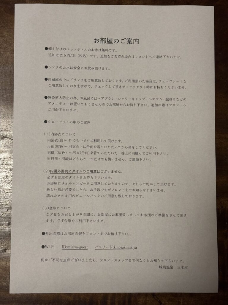 今回、週末に城崎温泉に行ってきました。お宿は、城崎温泉の中心部にある「城崎温泉 登録有形文化財の宿 三木屋」です。創業300年の老舗宿で、志賀直哉の名作「城の崎にて」が生まれた場所だそうです。