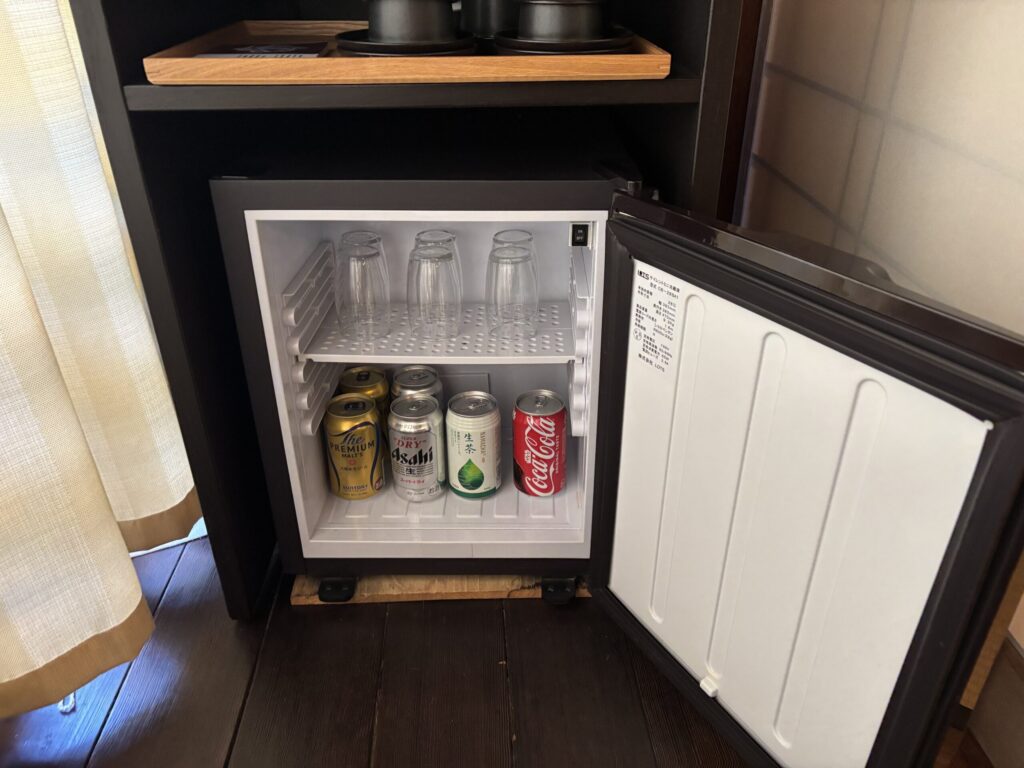 ペットボトルのお水は無料です。お茶コーナーのティーバッグはショップでも売られていました。冷蔵庫内に入っている缶ドリンクは有料です。