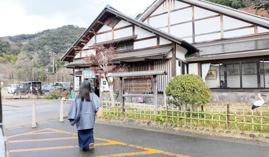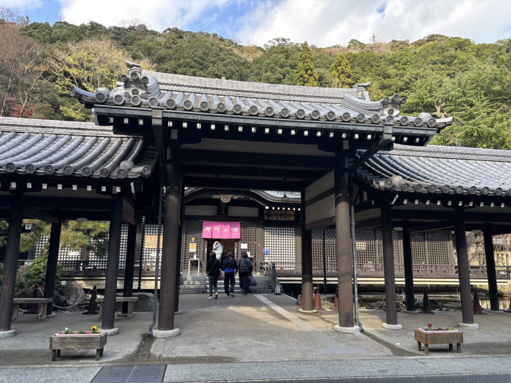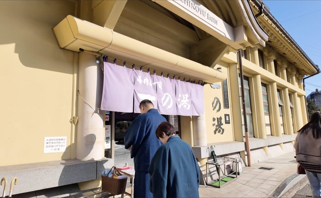 チェックアウト時刻の11時近くになったのでいったん宿に戻って洋服に着替え、チェックアウトの手続きをしました。「ゆめぱ」(外湯のパスポート)は13時まで使えるのですが、宿の駐車場は12時までとのこと。荷物を車に積んですぐ「御所の湯」へ。湯巡り用の宿のカゴやタオルは引き続き使えました。