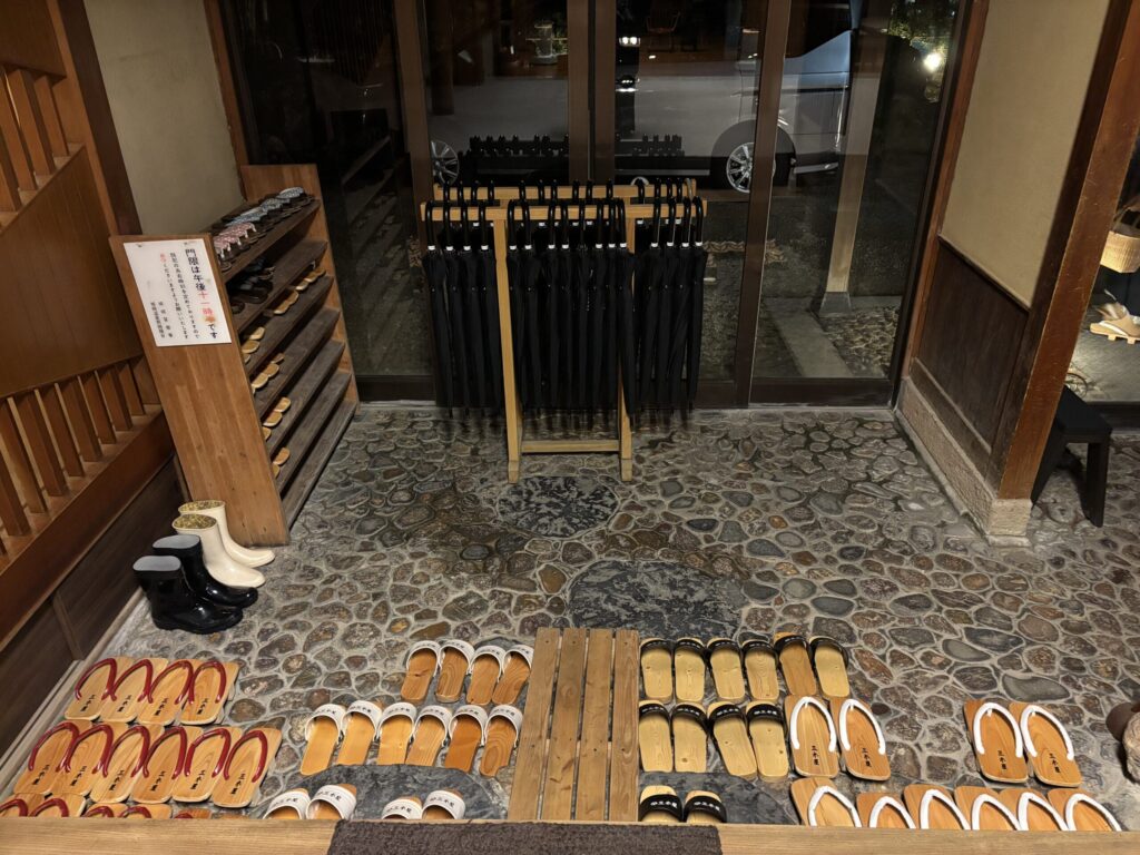 宿の玄関にはいろんな種類(子供サイズもあり)の下駄や傘が用意されています。