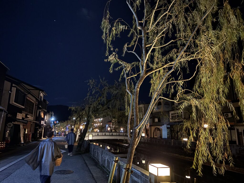 夜の灯りに枝垂れ柳、石橋のかかる川、とても風情がありますね〜♨️この風景は城崎ならでは✨