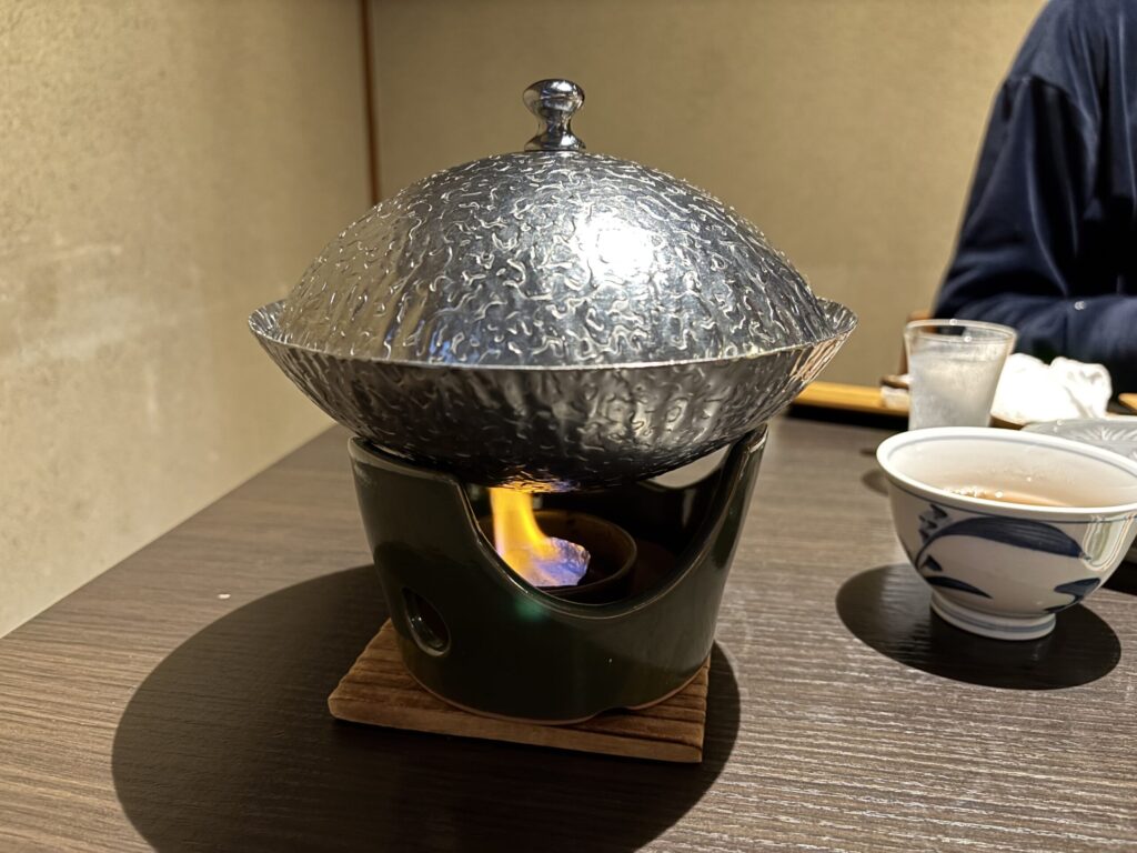 席に着くと、焼き魚と鍋が出されました。