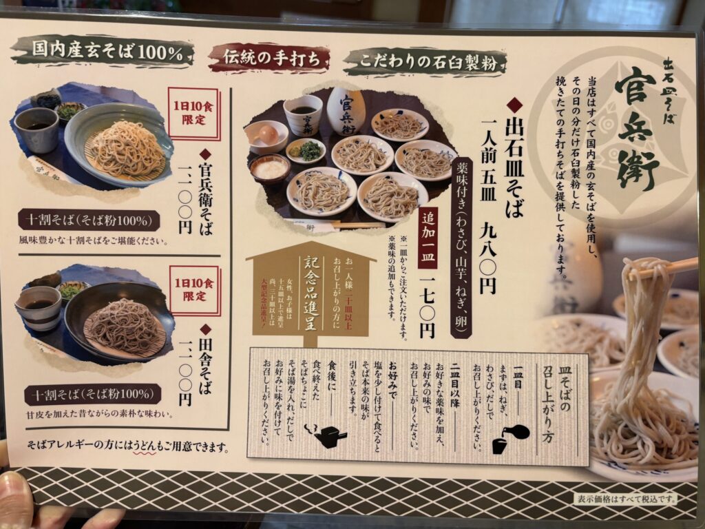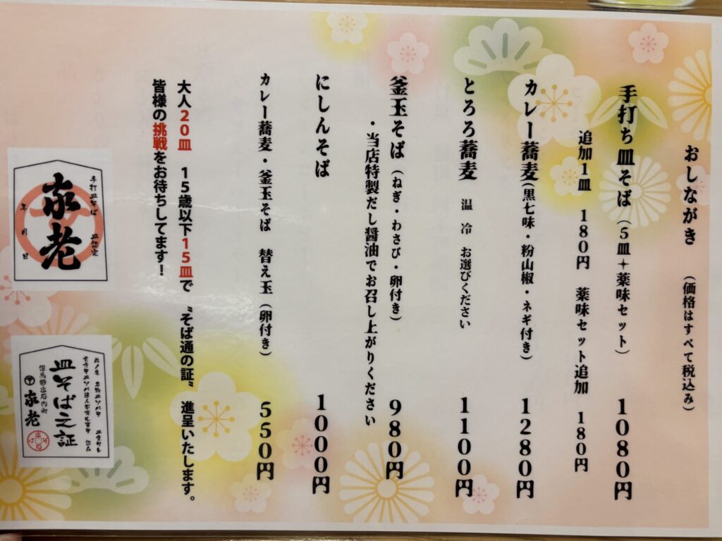 メニューはこんな感じ。皿そば以外に普通の一人前のメニューもありますが、ここはやっぱり皿そばを注文。