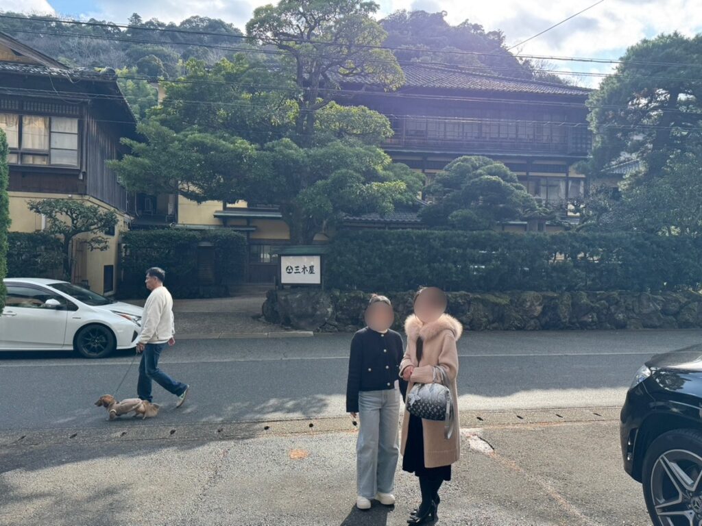 12時前に宿に戻って、カゴ、タオル、ゆめぱを宿に返却し、車へ。最後に三木屋の前でパチリ📷