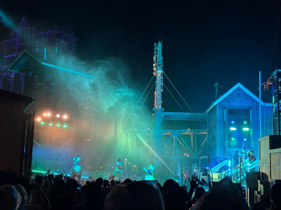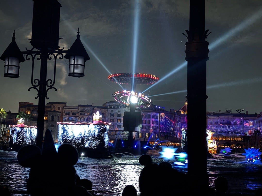 このショーの内容をまったく知らず、ウォーターキャノンからの水も来ないため、最初は遠くのステージを平和に眺めていました。