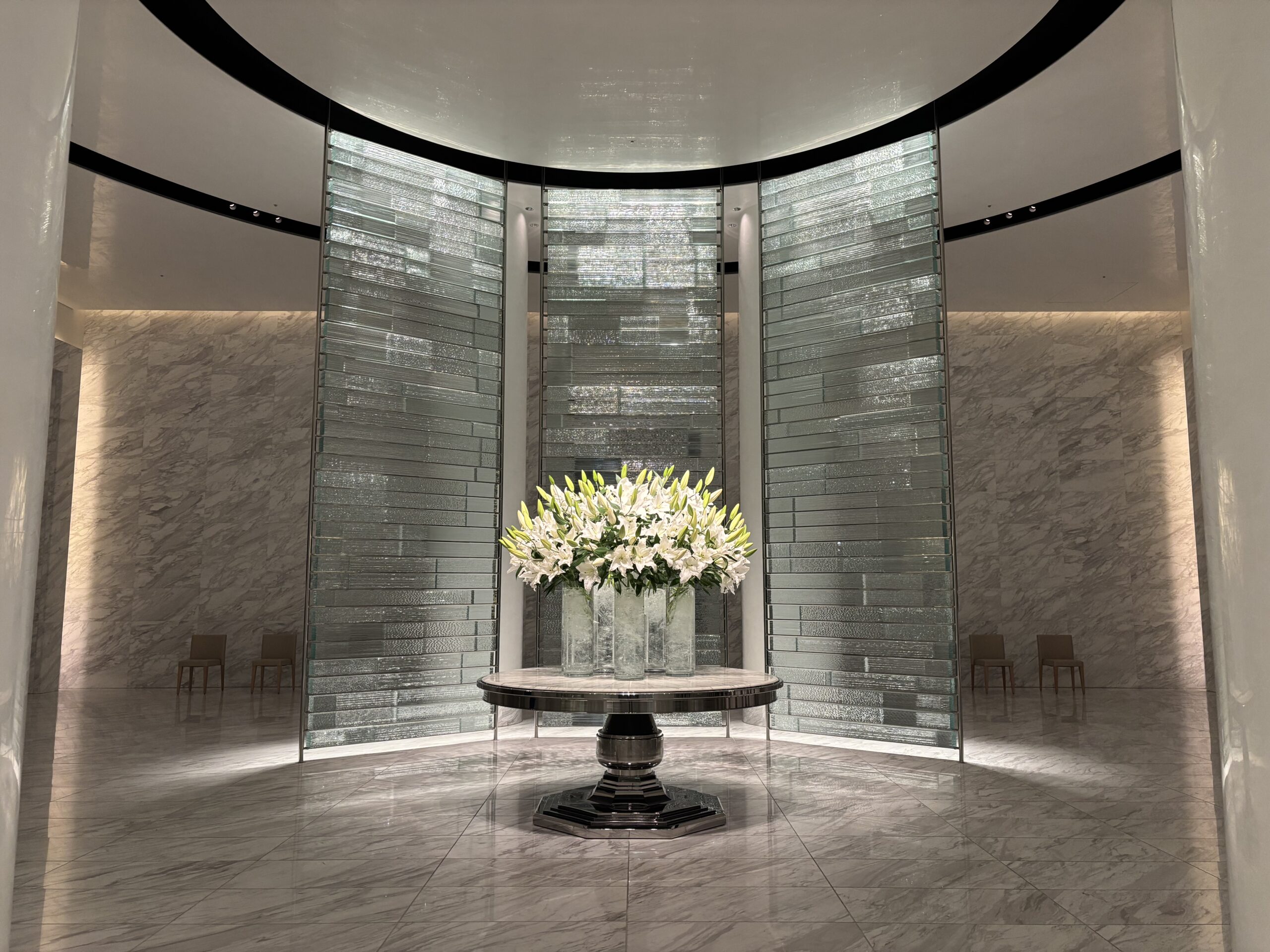 天井の高いエントランスは、白大理石で統一された明るく開放的な空間です。正面には大きな百合の花が生けられ、特別な空間に来た気分が高まります。
