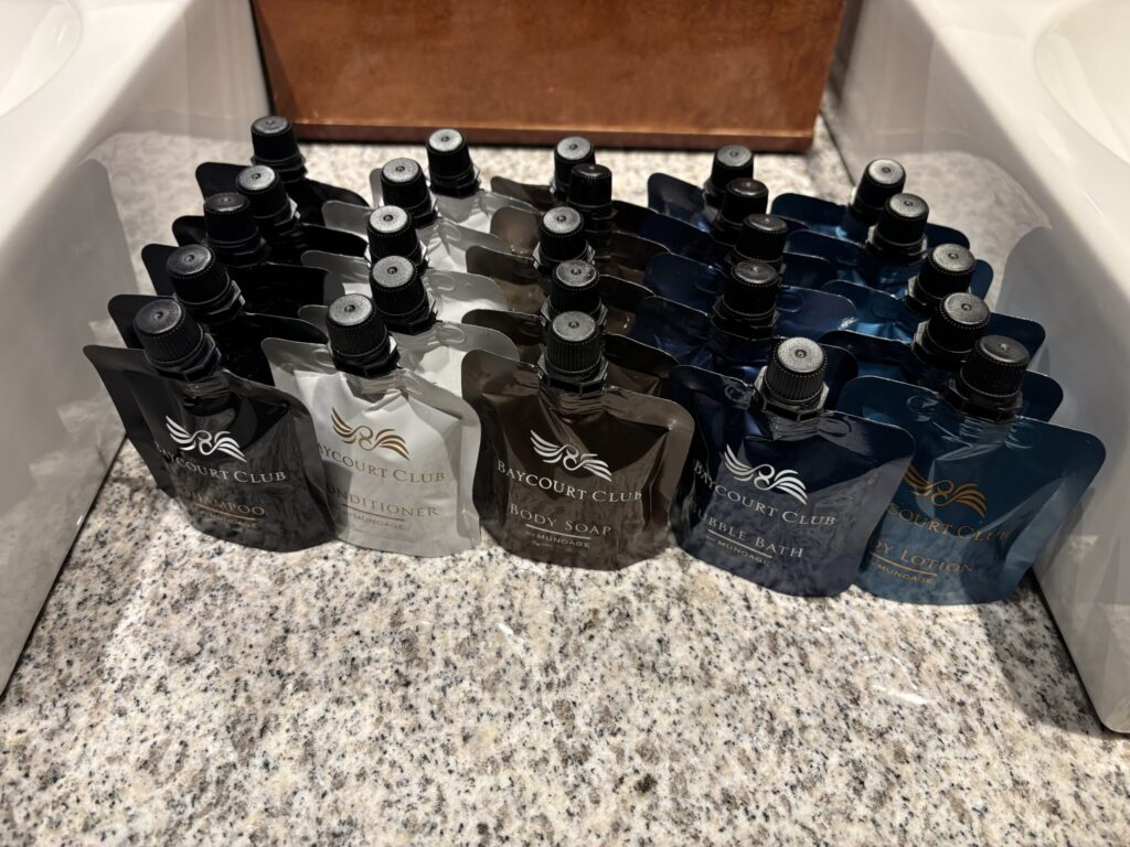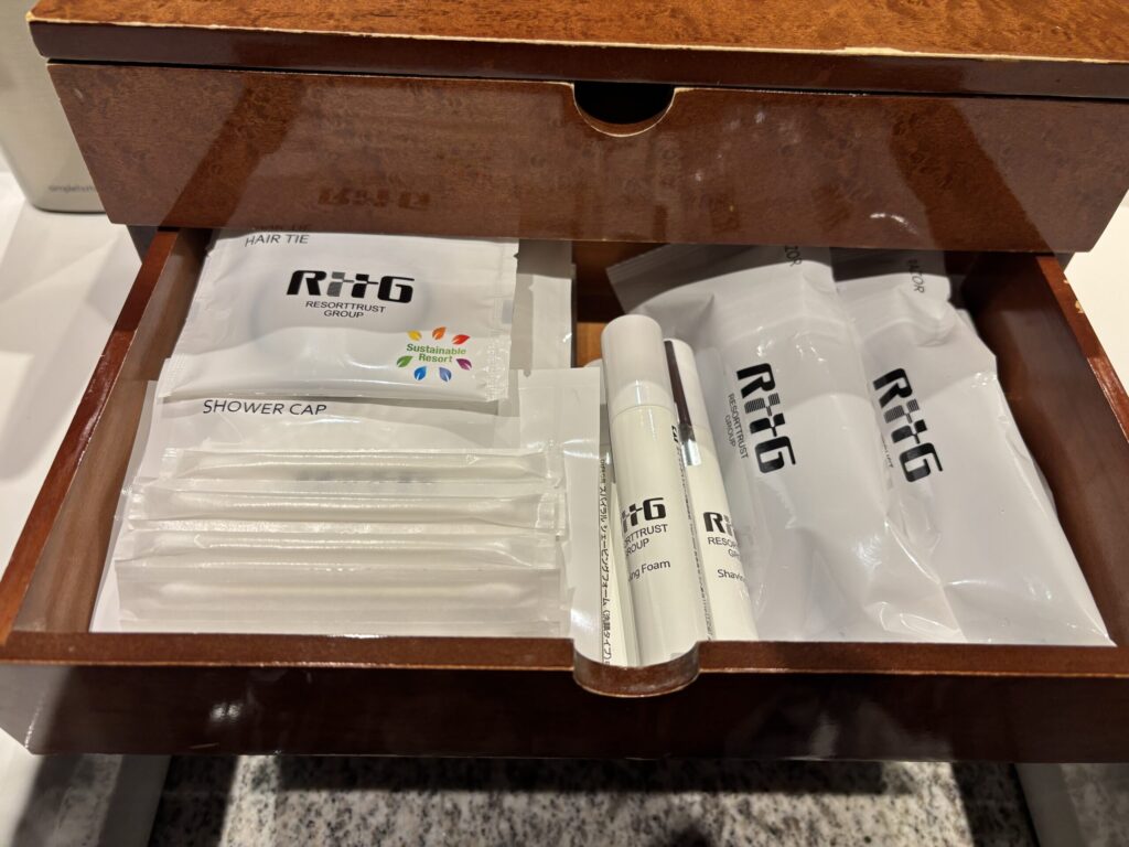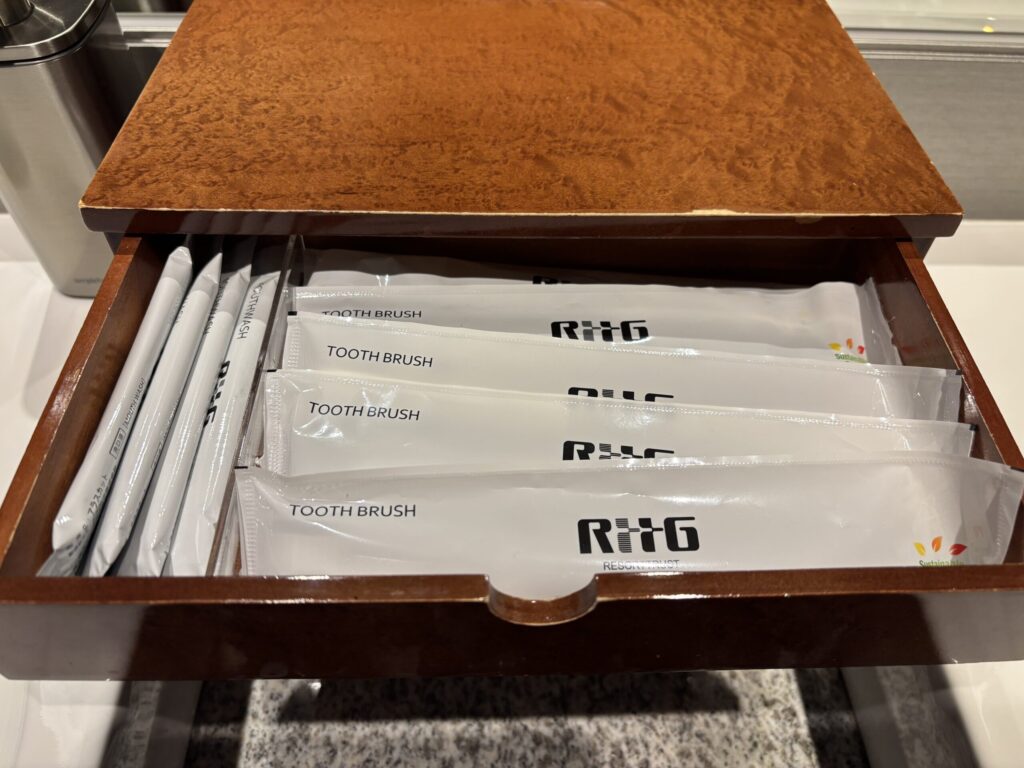 洗面所引き出し内にも大量のアメニティ。歯ブラシ、マウスウォッシュ、カミソリ、ヘアゴム、シェービングフォーム、ヘアブラシ、ボディスポンジ。どれも人数分ありました。こんなにアメニティがあるホテルは日本でもなかなか見たことがないです。