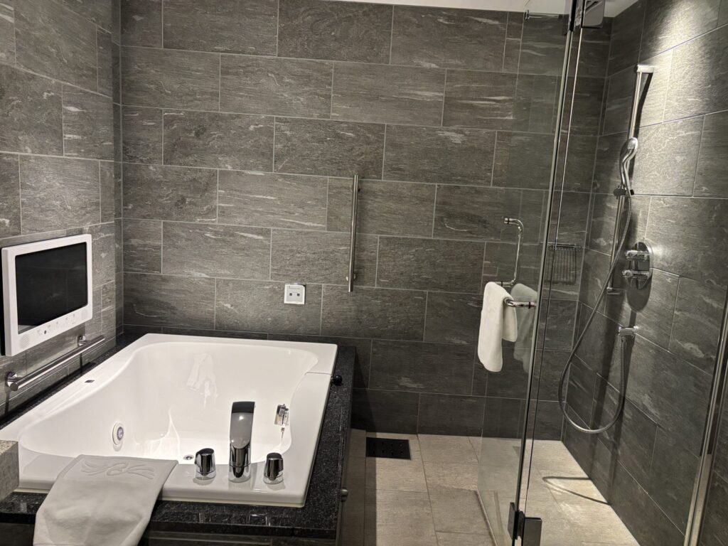 次にお風呂。バスタブが広く、大きめのTVが付いているのが珍しいです。横にあるシャワールームは、一見バスタブと独立のようですが、ドアを閉じると繋がっていて、日本式の洗い場と同じ使い勝手になるようにできいます。なのにバスタブがドアの中にないことで開放感も叶えることができていて、この間取りの発想には感動しました。