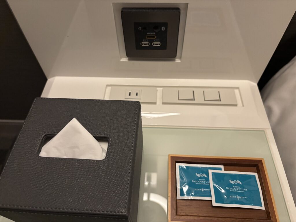 まずは設備。ベッドサイドやリビングのテレビ下にこのようなUSBポート(USB-A)が設けられていました。その上にあるのはHDMIポートです(何に使うのでしょうか)。このUSBポートはどのベッドサイドにもあるわけではなく、少なめでした。ベッドサイドの小さなパウチはミントです。
