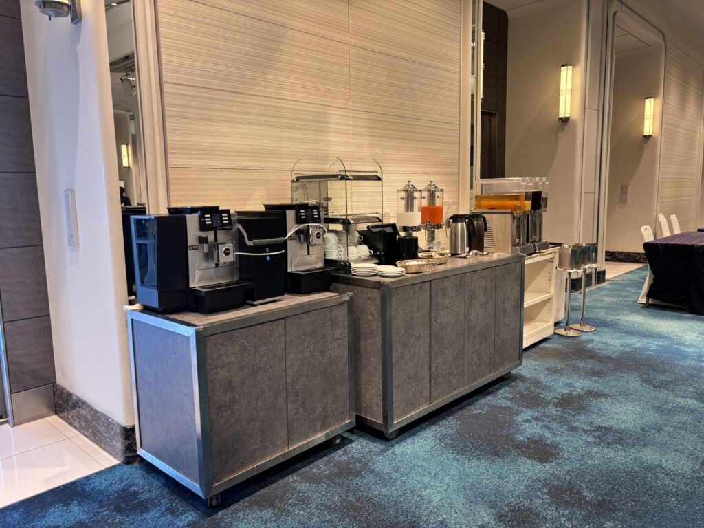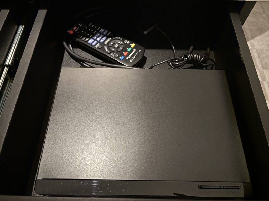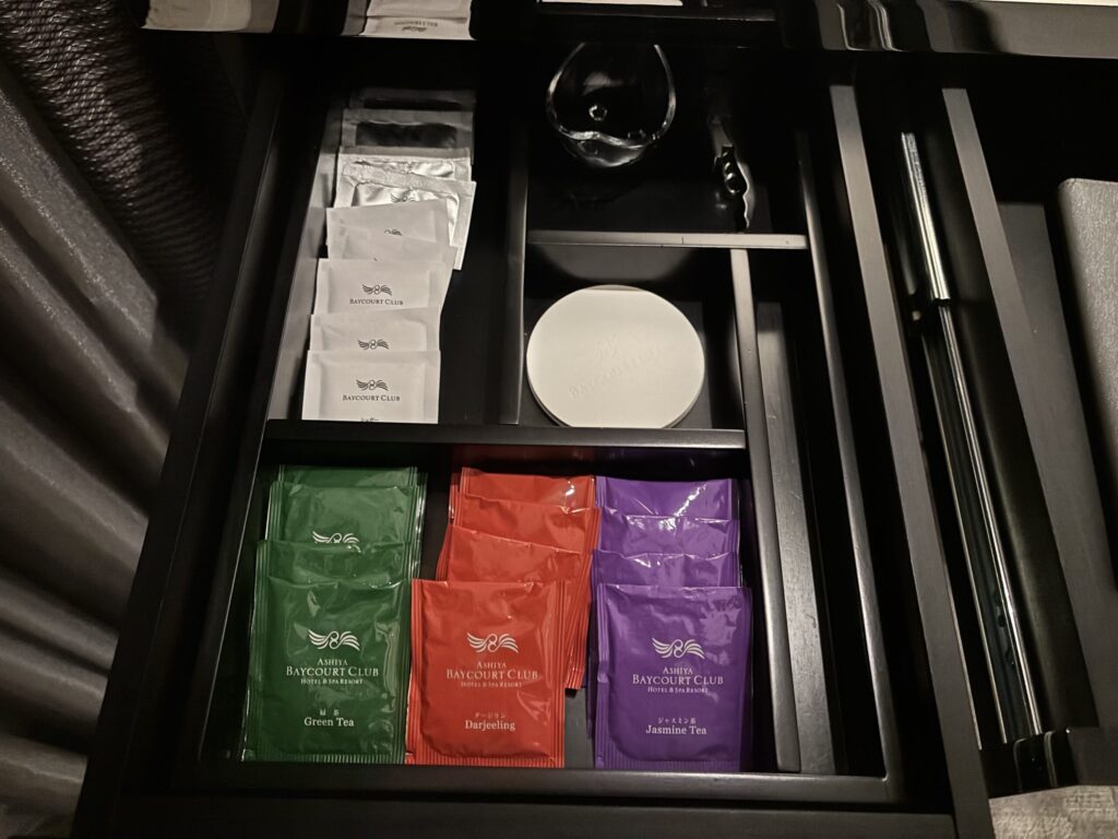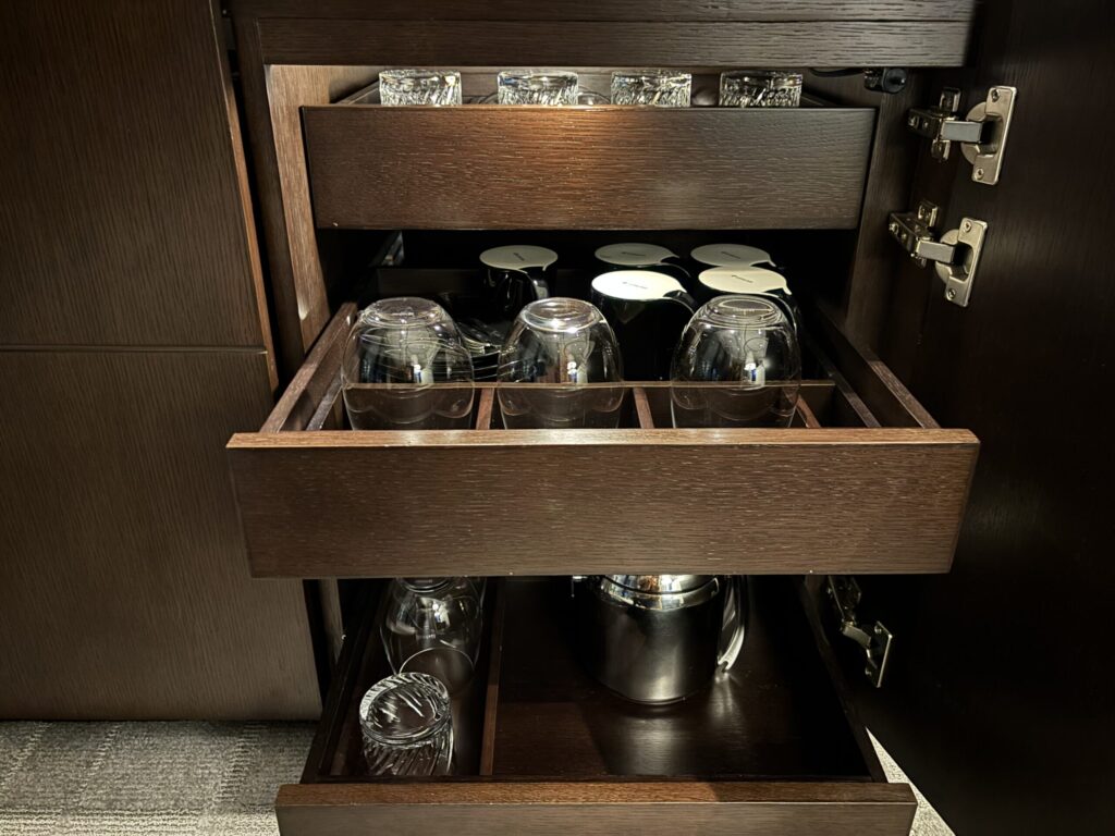 次にミニバーコーナーです。エスプレッソマシンに紅茶(ちゃんと5人分)、コップもたくさん用意されていました。DVDプレーヤーもありました。
