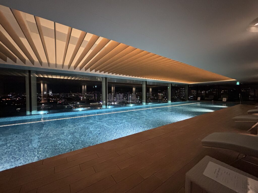 20時ごろプールに行ってみました。芦屋〜神戸の町並みを海から山まで見渡せる絶景です。建物自体はそれほど高層ではないにもかかわらず、想像以上に見晴らしが良く驚きました。夜は私たち夫婦以外に誰もおらず静寂の贅沢さを味わいました。