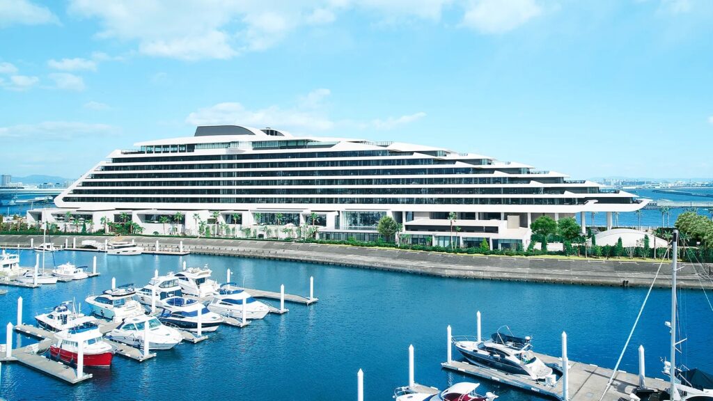 芦屋ベイコート倶楽部は芦屋市の海沿いにあり、目の前にヨットハーバーがあり海外リゾートのような雰囲気です。ホテル自体が船のような形をしていて、遠くからでもわかる特徴的なフォルムです。(画像は公式よりお借りしています)