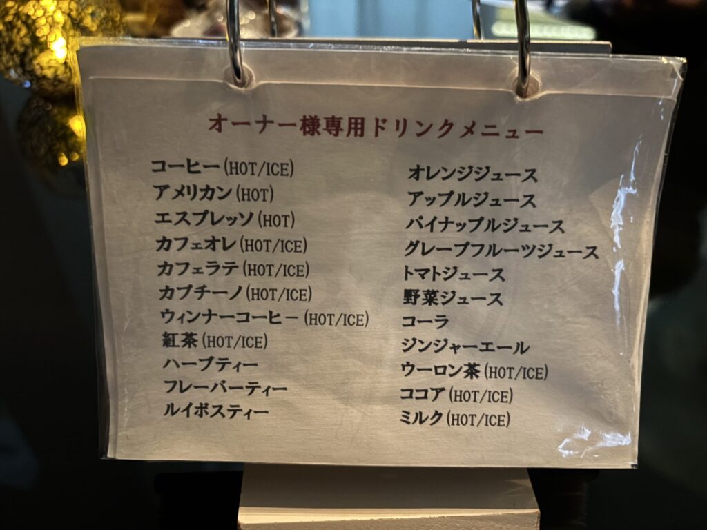 無料のドリンクはここから選べます。クラシカルな喫茶店のメニューという感じ。普段モダンな店に行きがちな我が家には新鮮でした。