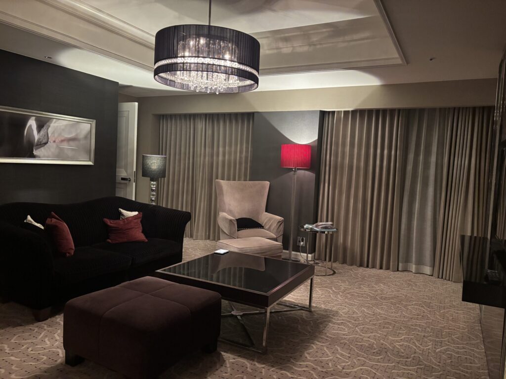 リビングは黒とベージュを基調としたシックで重厚なインテリア。ソファが何個かあり、ローテーブルにテレビ。とてもゆったりとしています。