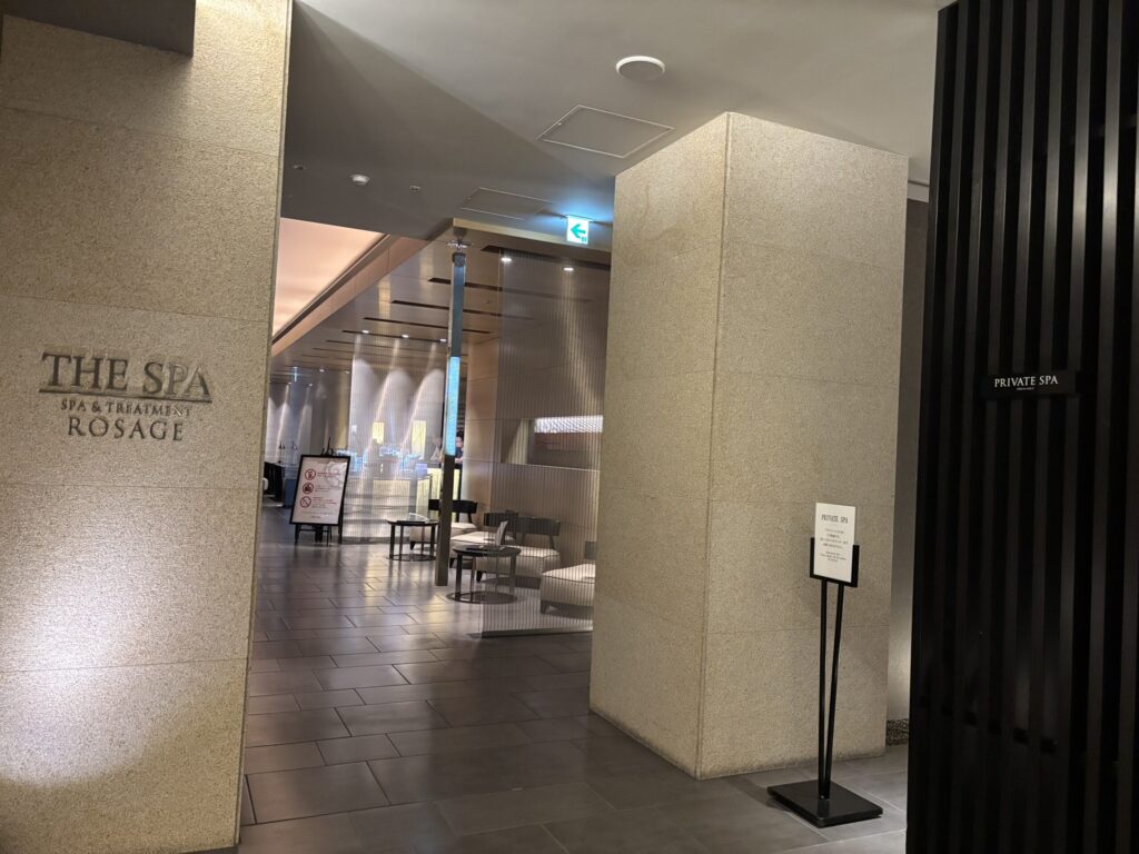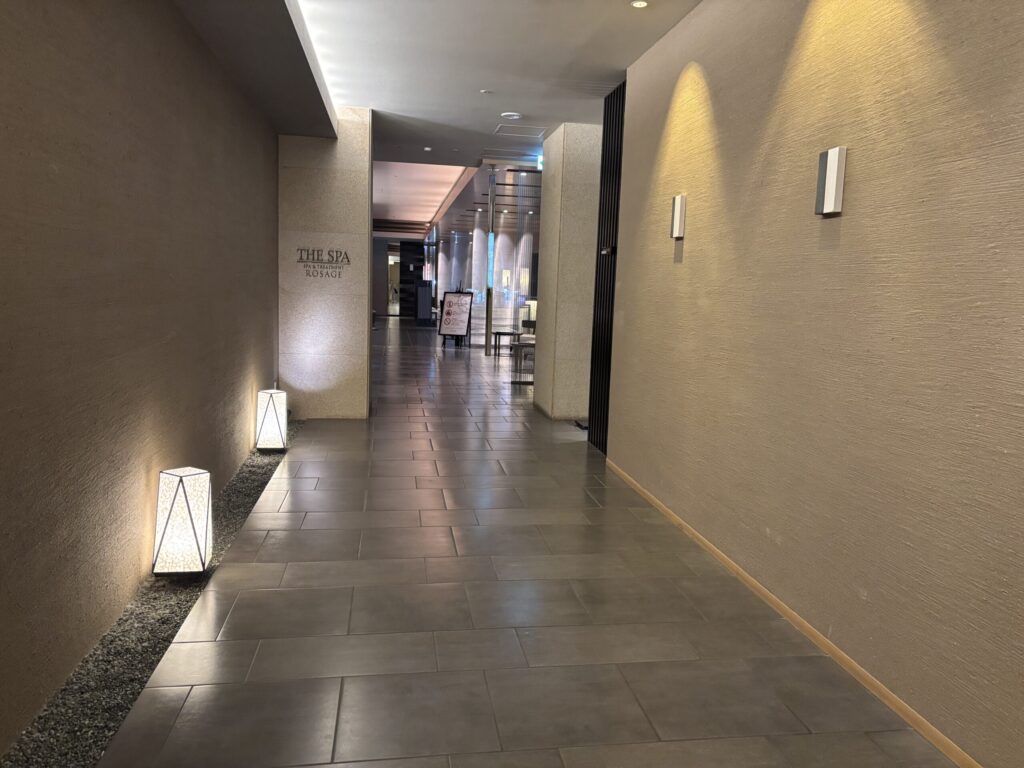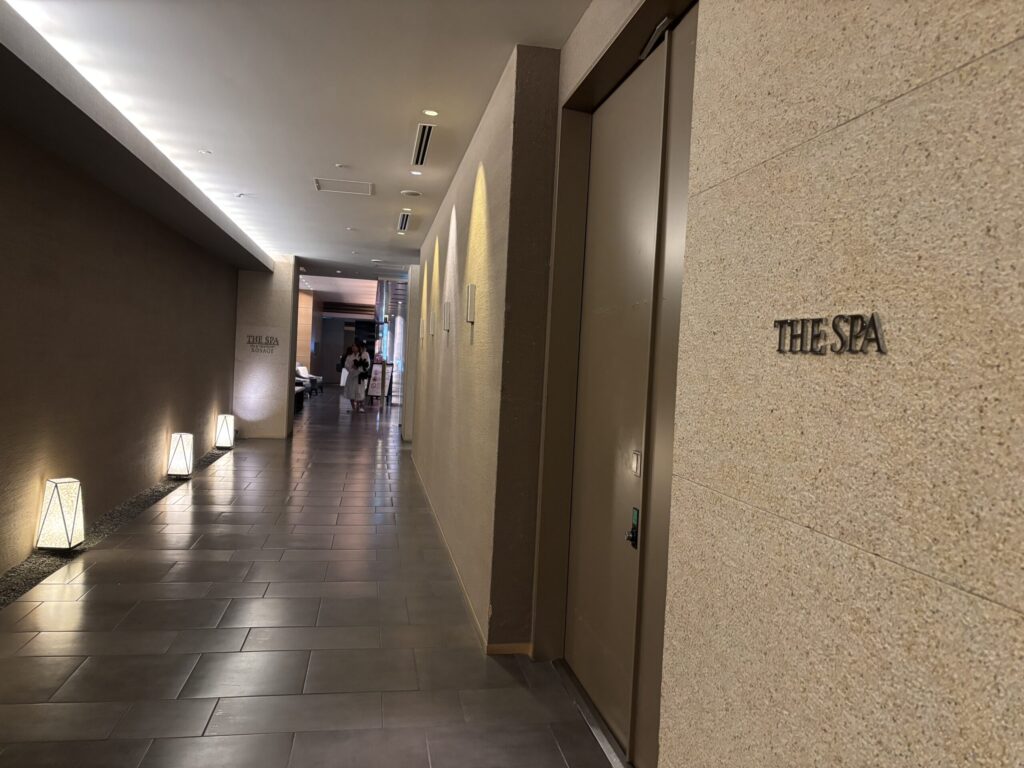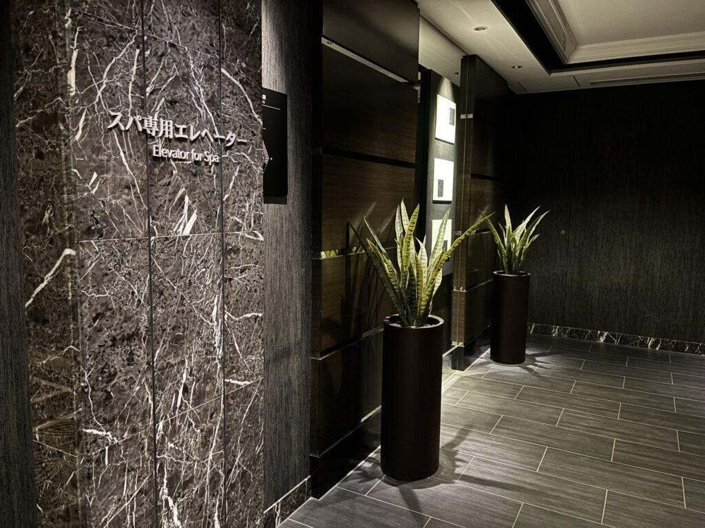 温泉には客室からこの専用エレベーターで向かいます。なのでバスローブで出歩くことができます。ベイコートも同じ動線ですけど、これ便利ですよね。